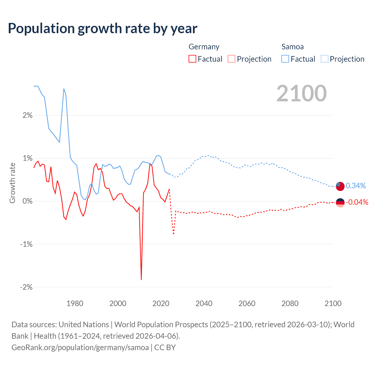 - For the last 10 years, Germany has had an average growth rate of +0.32% per year vs +0.87% in Samoa.