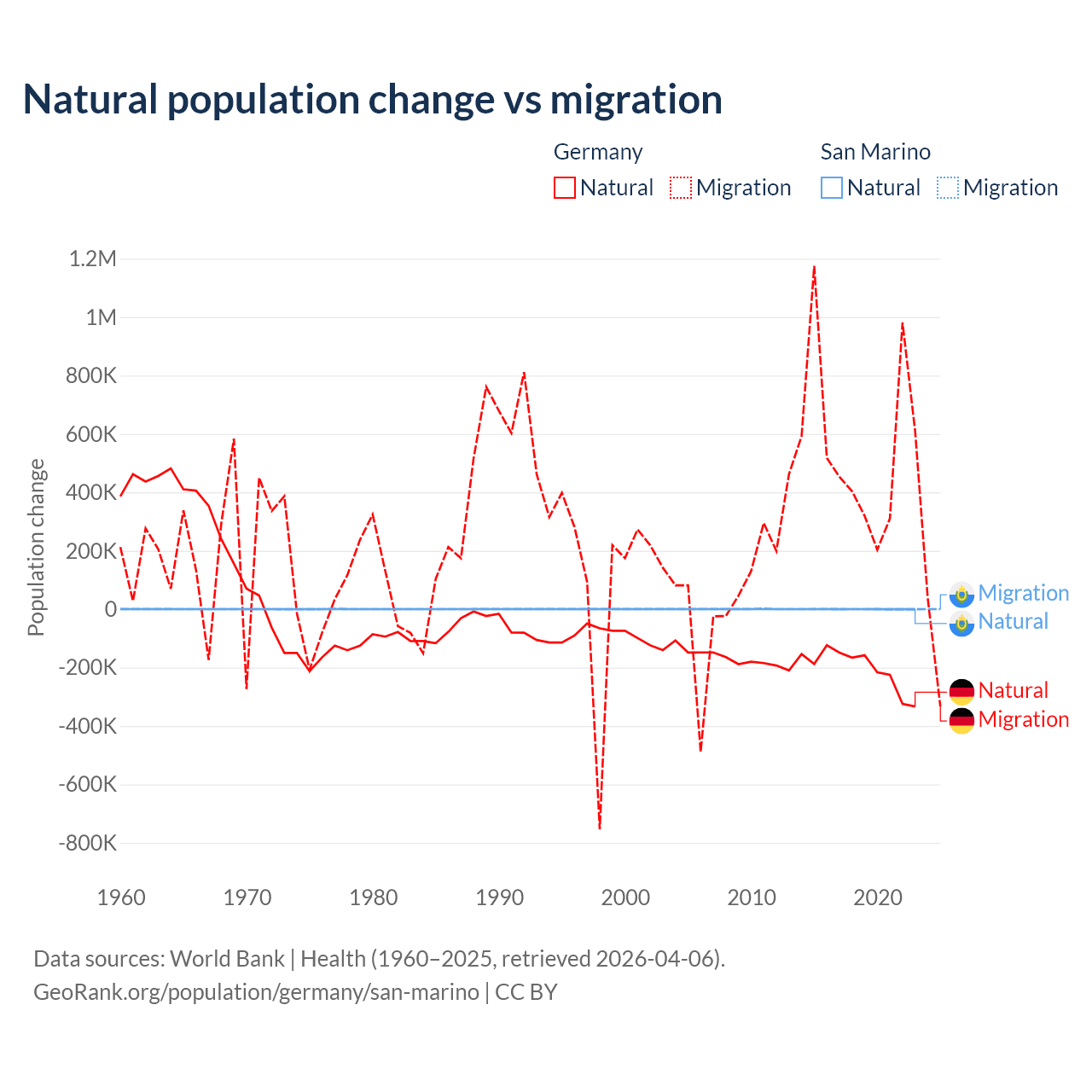 Over the last 10 years, 26.8% of the population change in Germany is from natural causes (a loss of 2,036,130 people) and 73.2% is from migration (a gain of 5,565,916 people). In San Marino 40.9% is from natural causes (a loss of 358 people) and 59.1% is from migration (a gain of 517 people).
