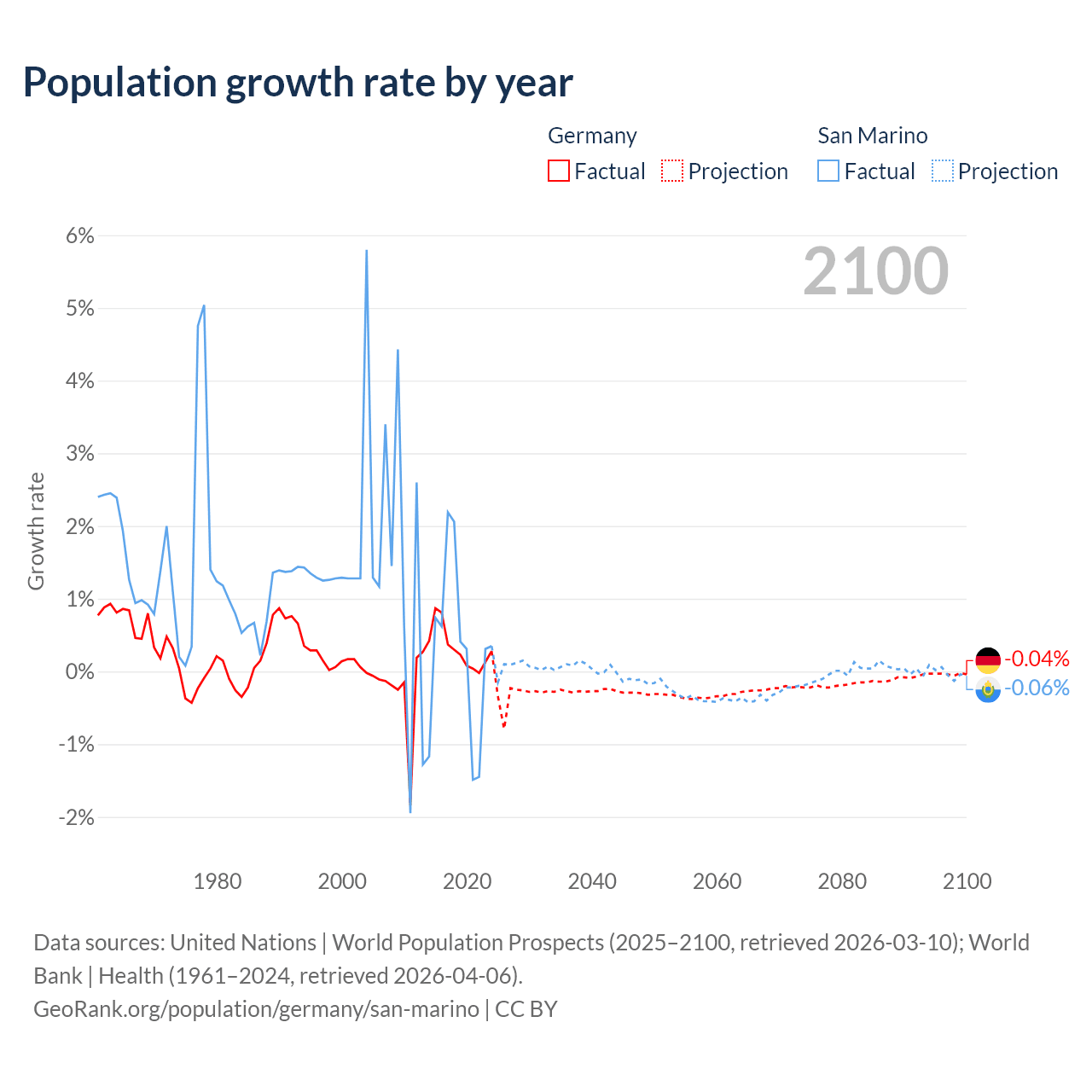 - For the last 10 years, Germany has had an average growth rate of +0.32% per year vs +0.26% in San Marino.