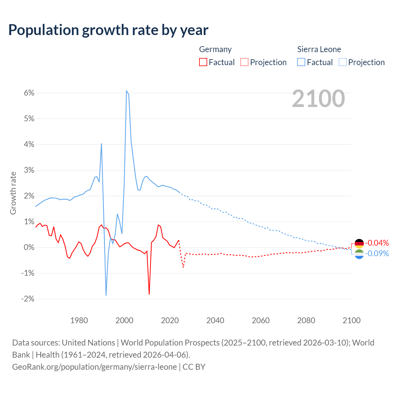 - For the last 10 years, Germany has had an average growth rate of +0.32% per year vs +2.32% in Sierra Leone.