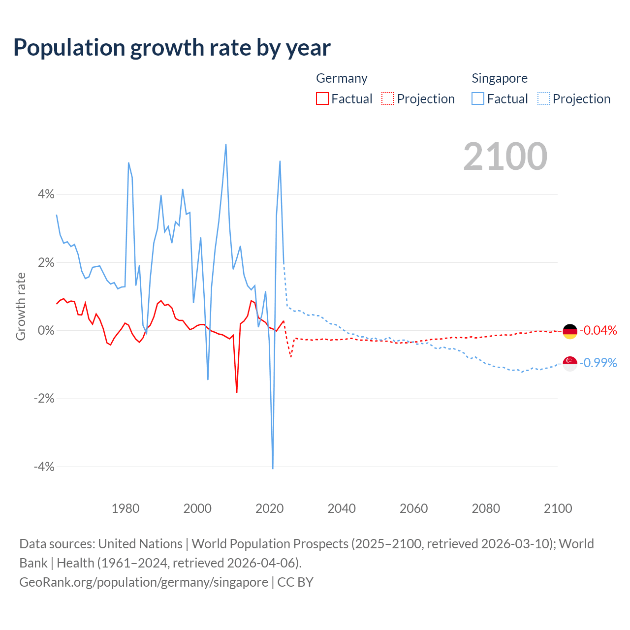 - For the last 10 years, Germany has had an average growth rate of +0.32% per year vs +1.04% in Singapore.