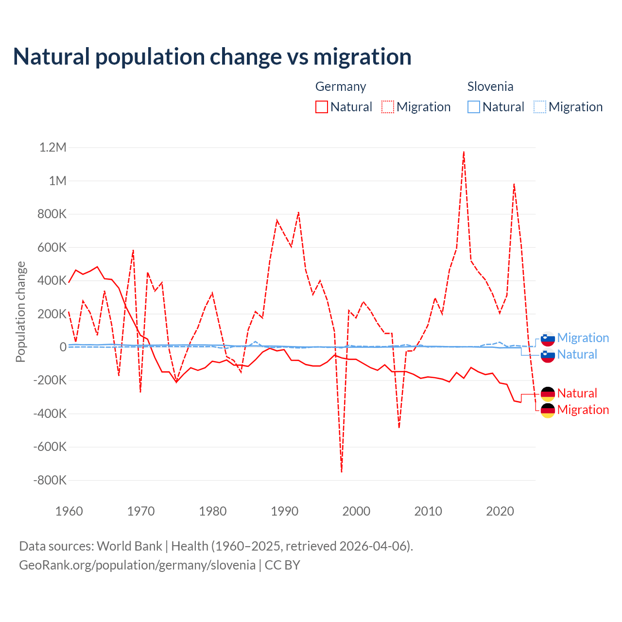 Over the last 10 years, 26.8% of the population change in Germany is from natural causes (a loss of 2,036,130 people) and 73.2% is from migration (a gain of 5,565,916 people). In Slovenia 18.1% is from natural causes (a loss of 17,573 people) and 81.9% is from migration (a gain of 79,532 people).