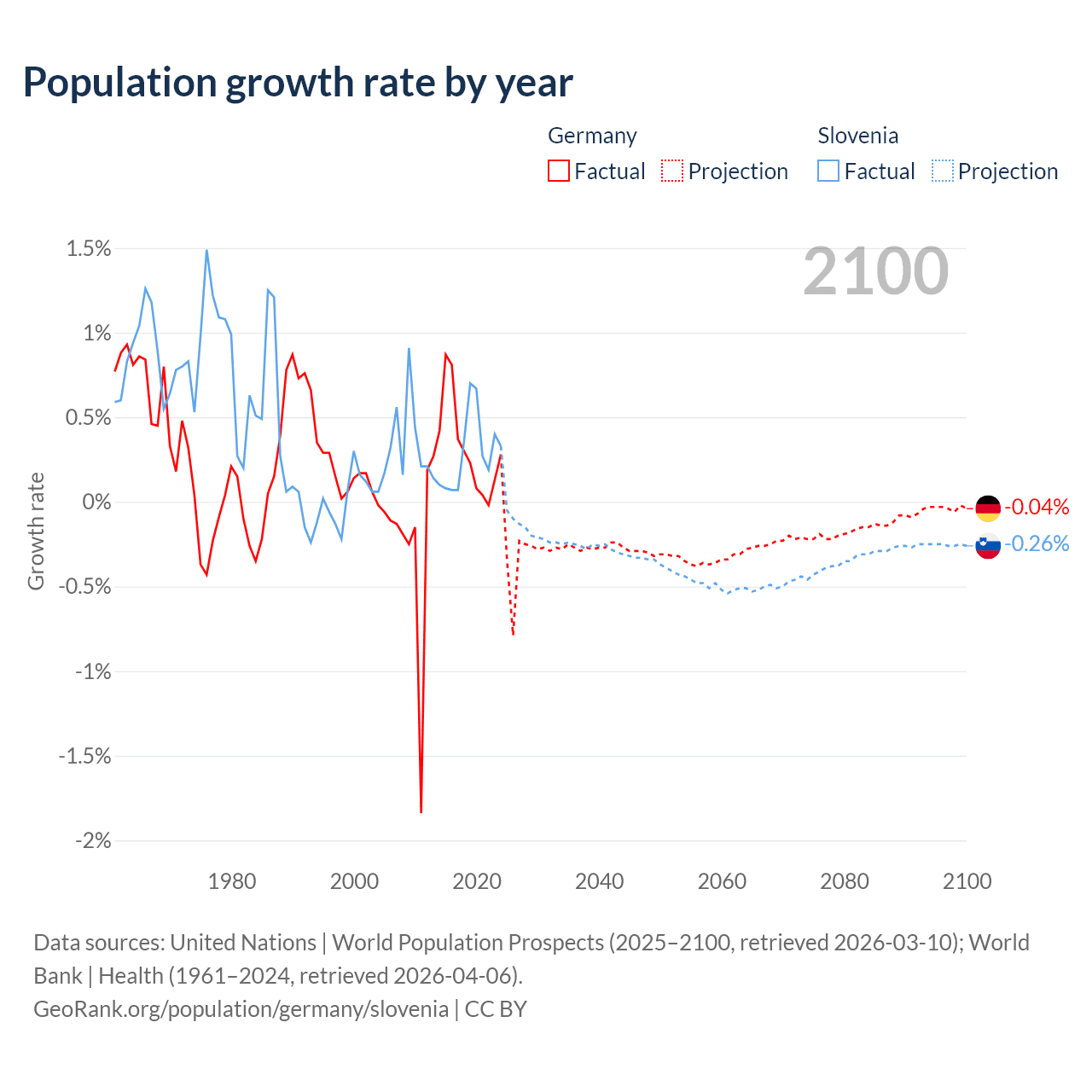 - For the last 10 years, Germany has had an average growth rate of +0.32% per year vs +0.29% in Slovenia.