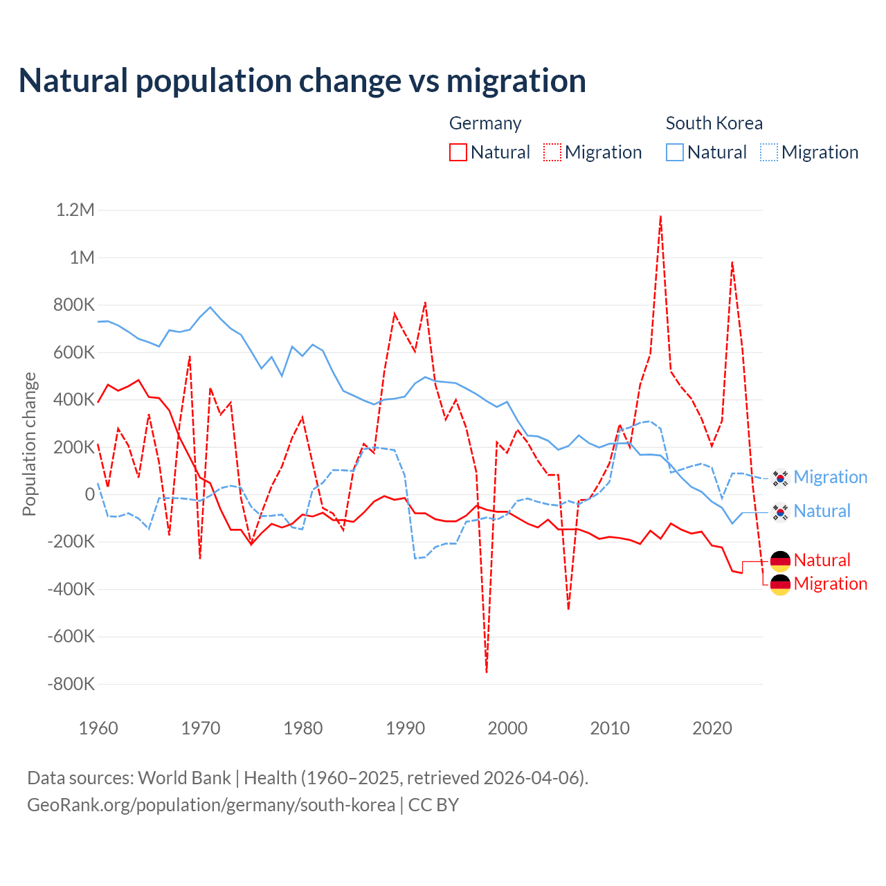 Over the last 10 years, 26.8% of the population change in Germany is from natural causes (a loss of 2,036,130 people) and 73.2% is from migration (a gain of 5,565,916 people). In South Korea 17.6% is from natural causes (a gain of 277,215 people) and 82.4% is from migration (a gain of 1,298,356 people).