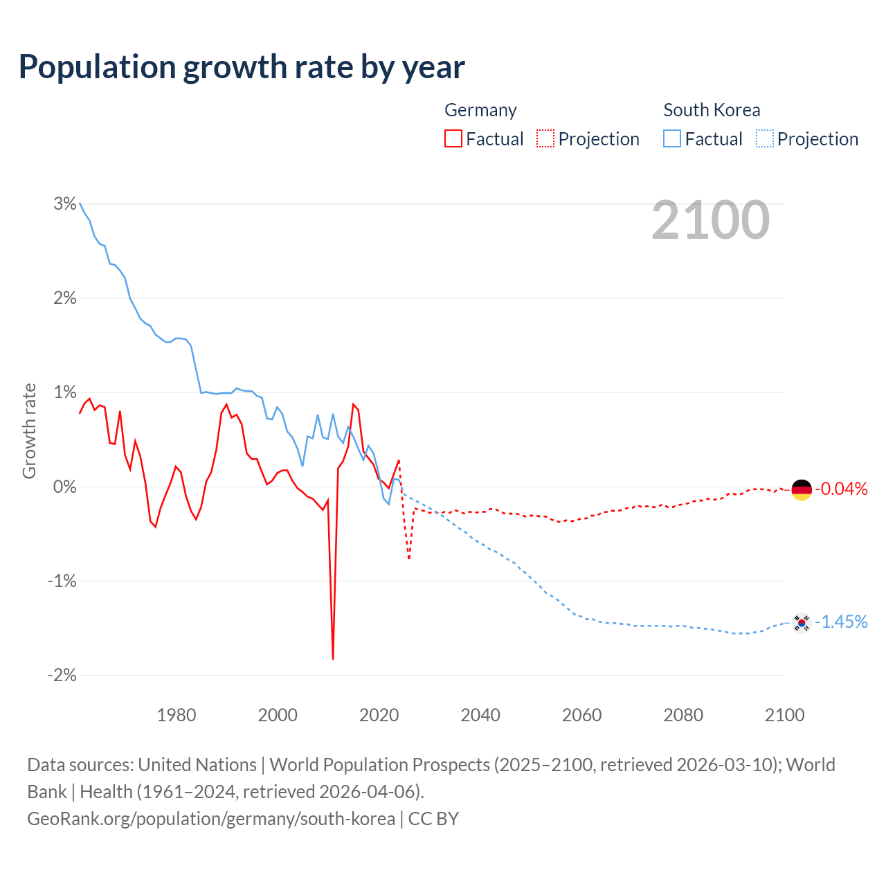 - For the last 10 years, Germany has had an average growth rate of +0.32% per year vs +0.24% in South Korea.