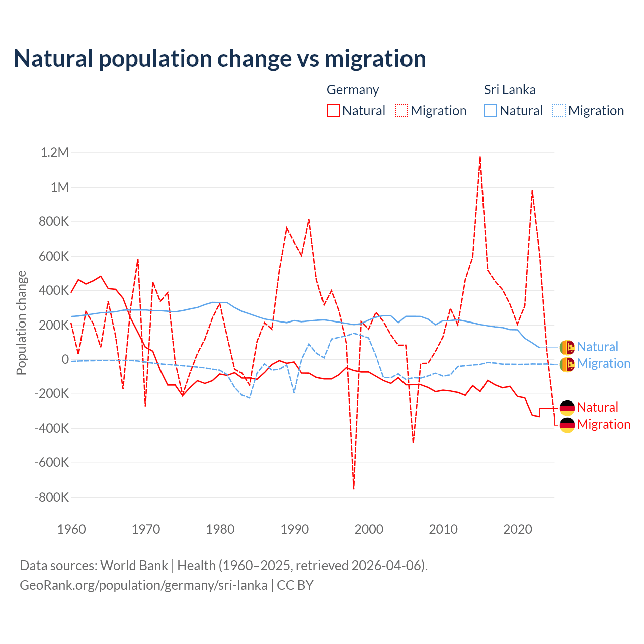Over the last 10 years, 26.8% of the population change in Germany is from natural causes (a loss of 2,036,130 people) and 73.2% is from migration (a gain of 5,565,916 people). In Sri Lanka 85.3% is from natural causes (a gain of 1,605,749 people) and 14.7% is from migration (a loss of 276,121 people).