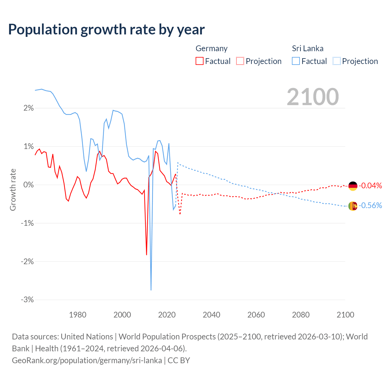 - For the last 10 years, Germany has had an average growth rate of +0.32% per year vs +0.57% in Sri Lanka.