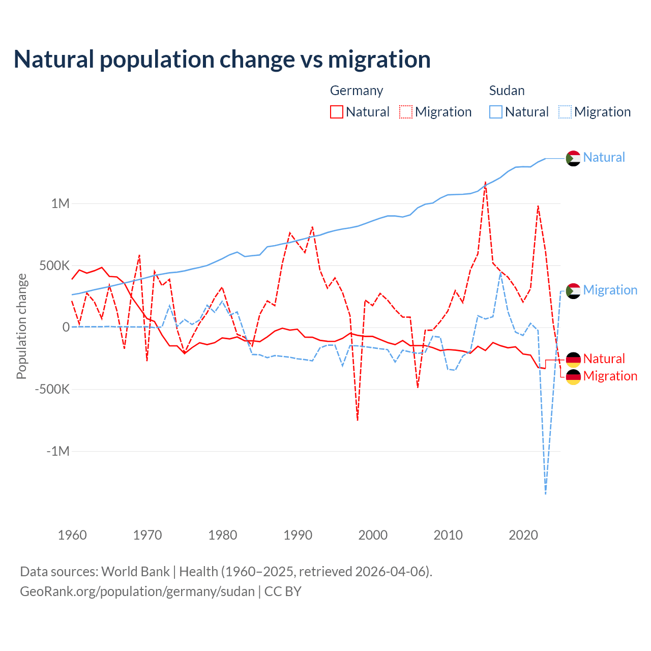 Over the last 10 years, 26.8% of the population change in Germany is from natural causes (a loss of 2,036,130 people) and 73.2% is from migration (a gain of 5,565,916 people). In Sudan 95.1% is from natural causes (a gain of 12,459,977 people) and 4.88% is from migration (a loss of 639,596 people).