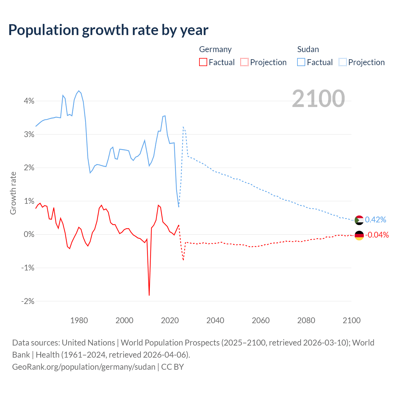 - For the last 10 years, Germany has had an average growth rate of +0.32% per year vs +2.67% in Sudan.