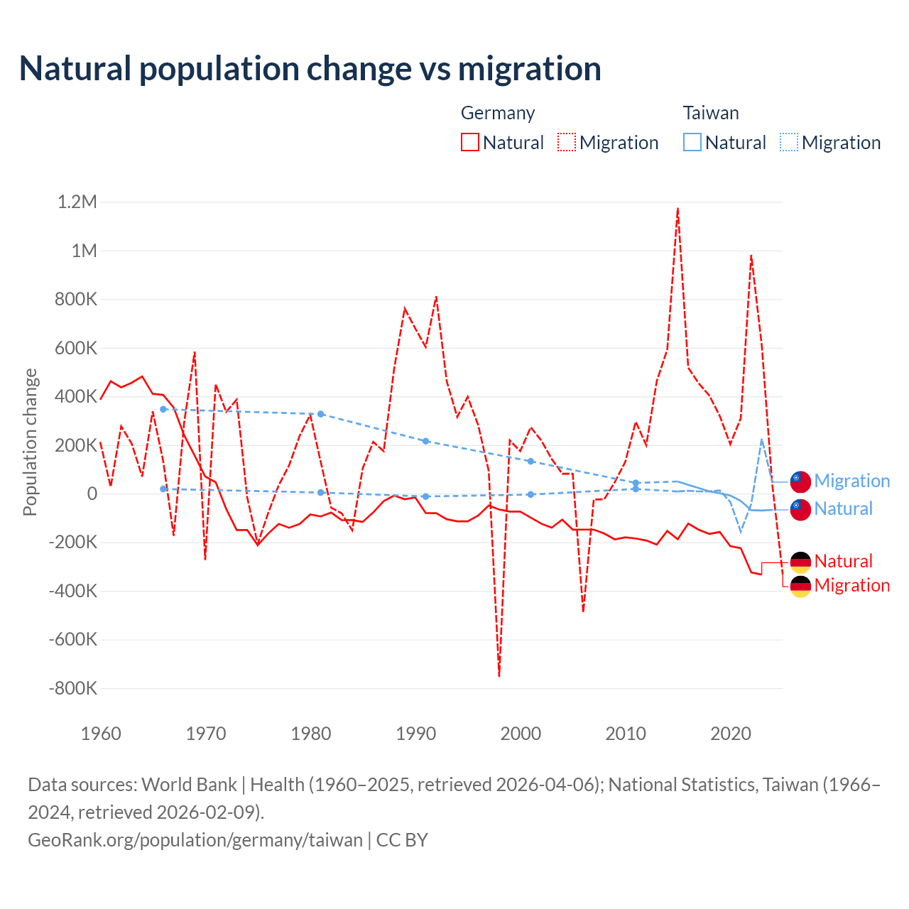 Over the last 10 years, 26.8% of the population change in Germany is from natural causes (a loss of 2,036,130 people) and 73.2% is from migration (a gain of 5,565,916 people). In Taiwan 56.7% is from natural causes (a loss of 57,467 people) and 43.3% is from migration (a gain of 43,884 people).