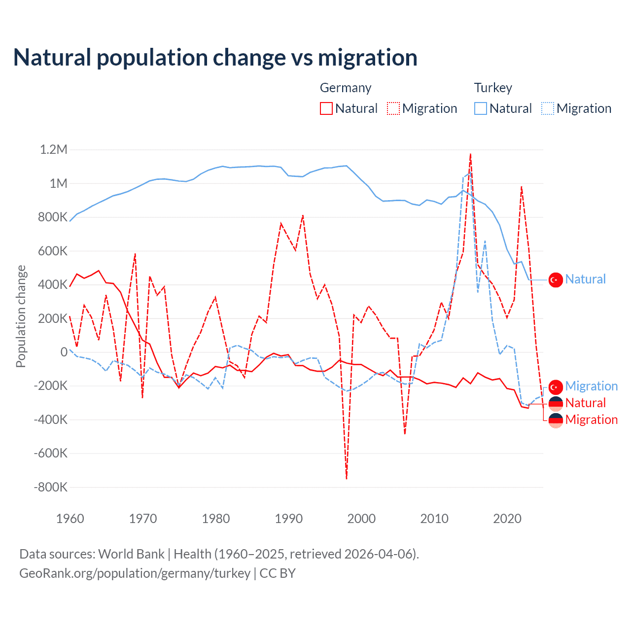 Over the last 10 years, 26.8% of the population change in Germany is from natural causes (a loss of 2,036,130 people) and 73.2% is from migration (a gain of 5,565,916 people). In Turkey 73% is from natural causes (a gain of 7,333,352 people) and 27% is from migration (a gain of 2,718,916 people).