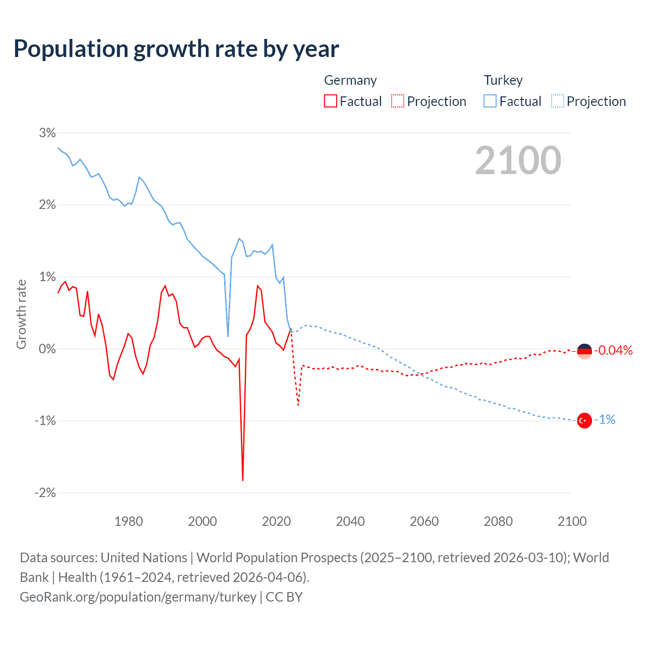 - For the last 10 years, Germany has had an average growth rate of +0.32% per year vs +1.06% in Turkey.