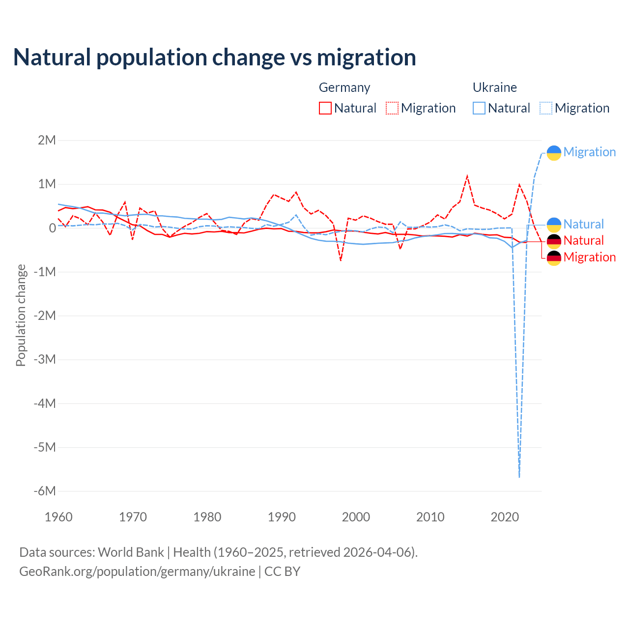 Over the last 10 years, 26.8% of the population change in Germany is from natural causes (a loss of 2,036,130 people) and 73.2% is from migration (a gain of 5,565,916 people). In Ukraine 28.2% is from natural causes (a loss of 2,435,153 people) and 71.8% is from migration (a loss of 6,198,995 people).