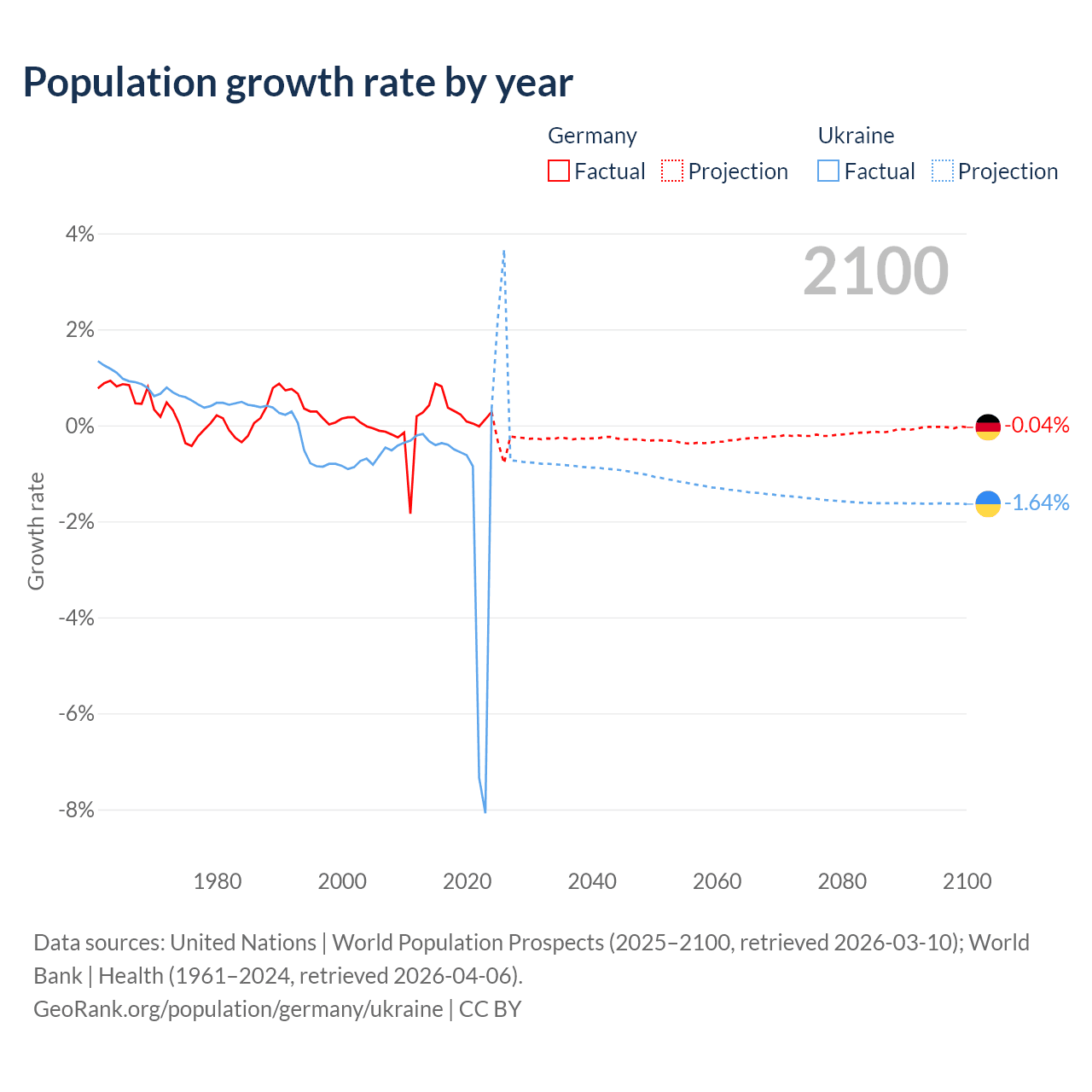 - For the last 10 years, Germany has had an average growth rate of +0.32% per year vs -1.74% in Ukraine.