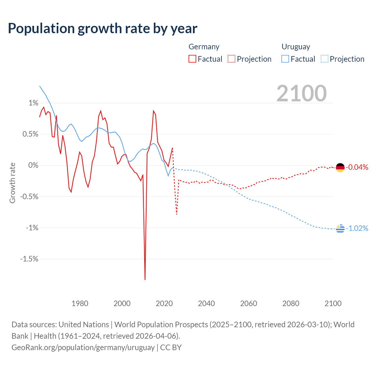 - For the last 10 years, Germany has had an average growth rate of +0.32% per year vs +0.11% in Uruguay.