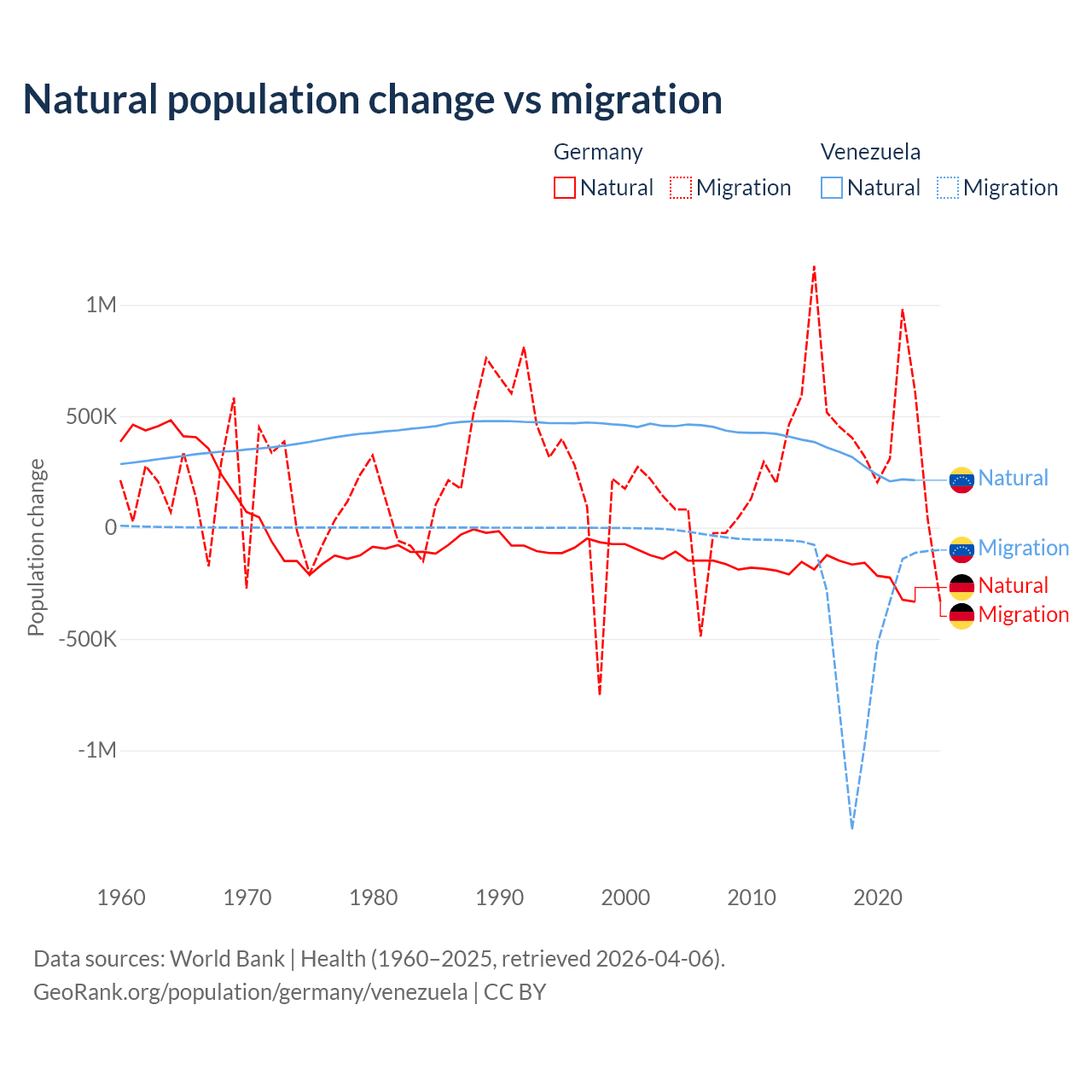 Over the last 10 years, 26.8% of the population change in Germany is from natural causes (a loss of 2,036,130 people) and 73.2% is from migration (a gain of 5,565,916 people). In Venezuela 38.6% is from natural causes (a gain of 2,946,257 people) and 61.4% is from migration (a loss of 4,683,227 people).