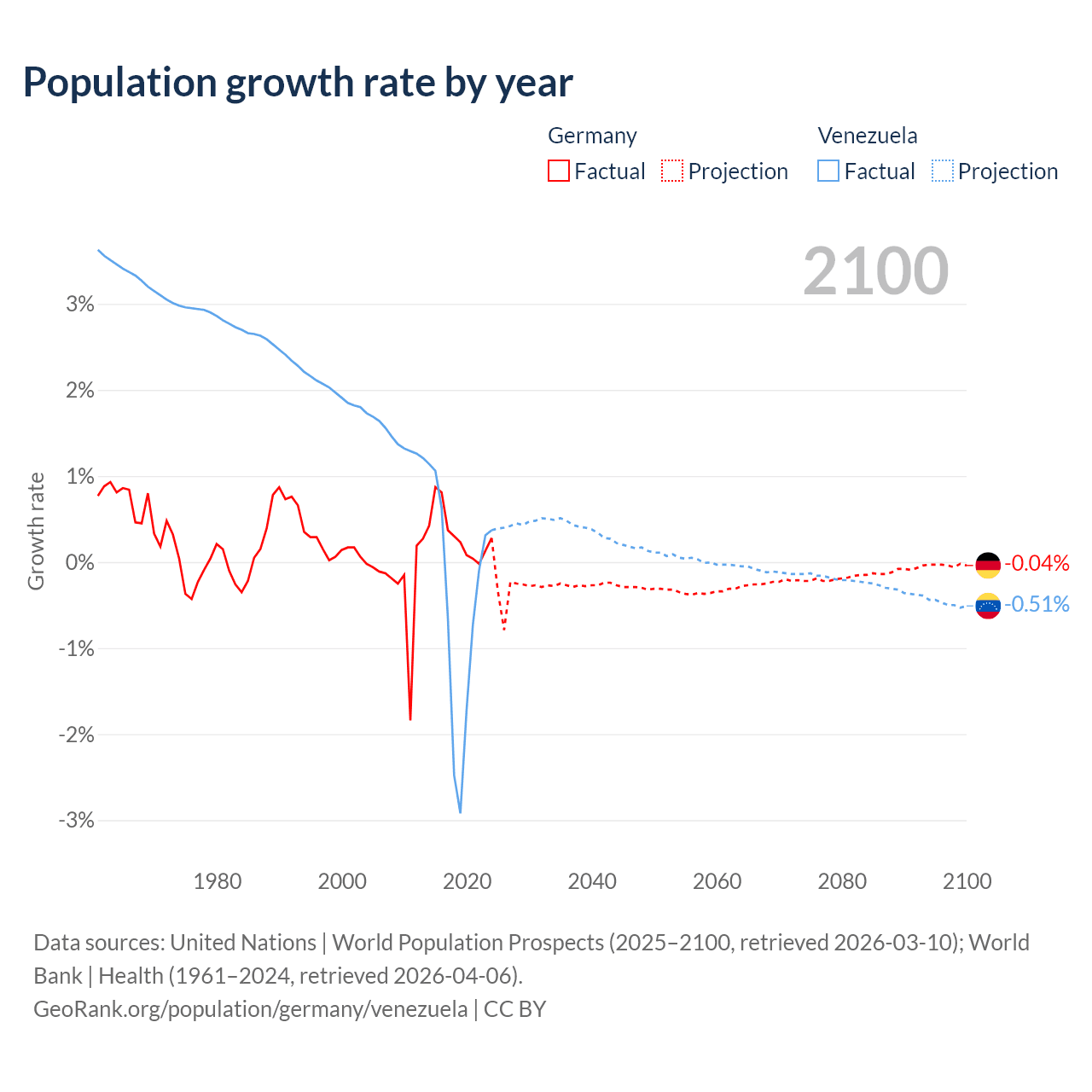 - For the last 10 years, Germany has had an average growth rate of +0.32% per year vs -0.46% in Venezuela.