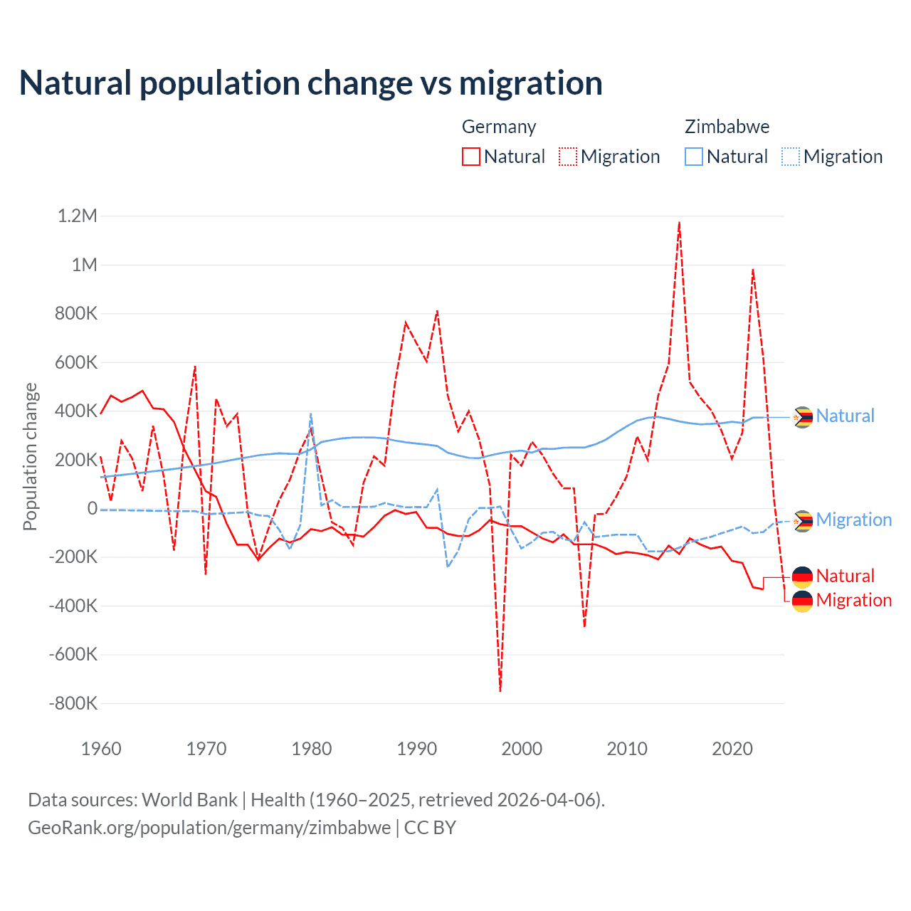 Over the last 10 years, 26.8% of the population change in Germany is from natural causes (a loss of 2,036,130 people) and 73.2% is from migration (a gain of 5,565,916 people). In Zimbabwe 74.9% is from natural causes (a gain of 3,558,487 people) and 25.1% is from migration (a loss of 1,192,807 people).