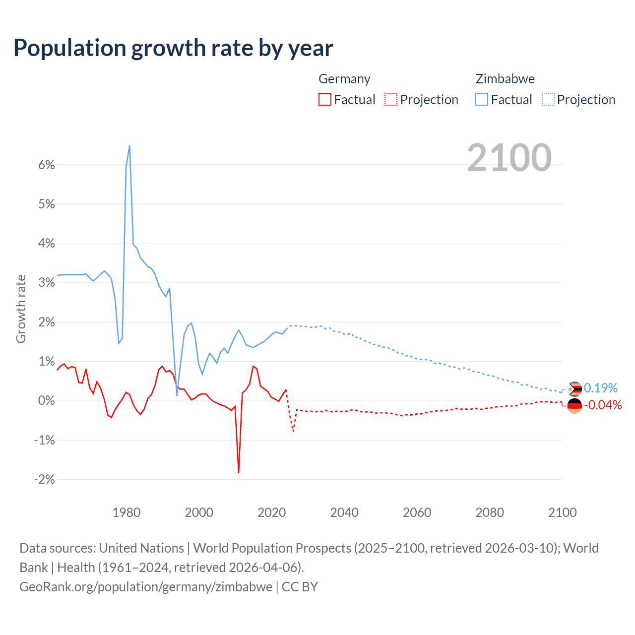 - For the last 10 years, Germany has had an average growth rate of +0.32% per year vs +1.57% in Zimbabwe.