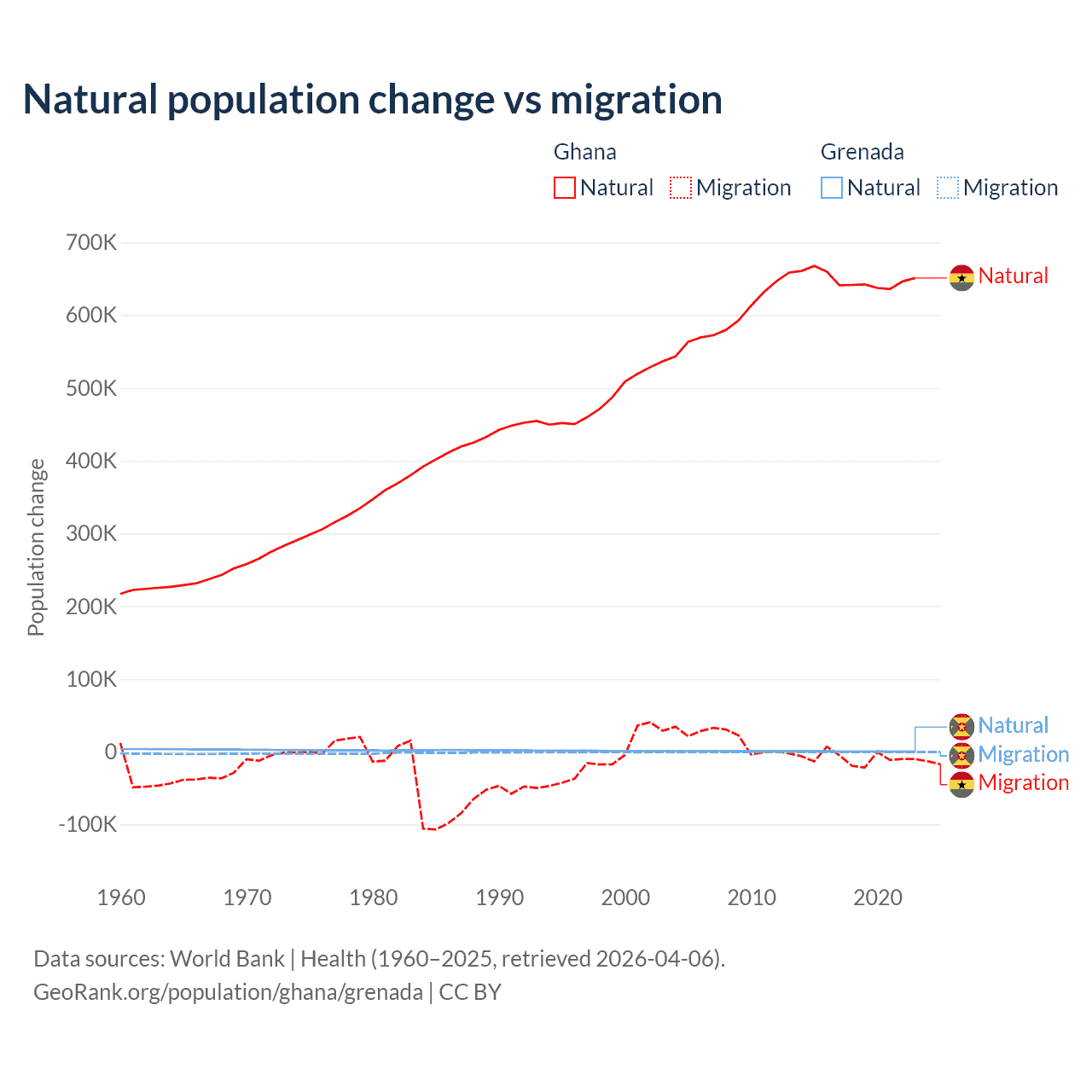 Over the last 10 years, 98.6% of the population change in Ghana is from natural causes (a gain of 6,484,449 people) and 1.37% is from migration (a loss of 90,310 people). In Grenada 76% is from natural causes (a gain of 4,850 people) and 24% is from migration (a loss of 1,535 people).