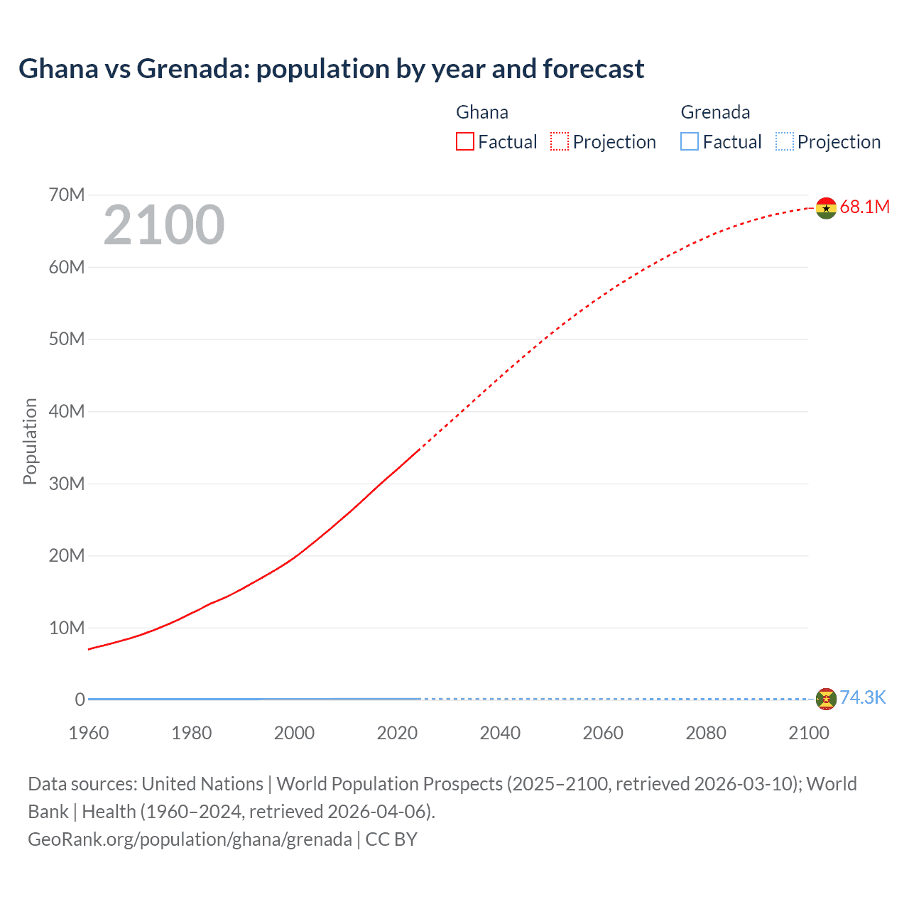 The latest officially reported population of Ghana was 34,427,414 in 2024 vs 117,207 people in Grenada in 2024. In 2026, based on the adjusted UN estimation, the current Ghana's population is 35,885,254 people compared to 117,407 in Grenada.