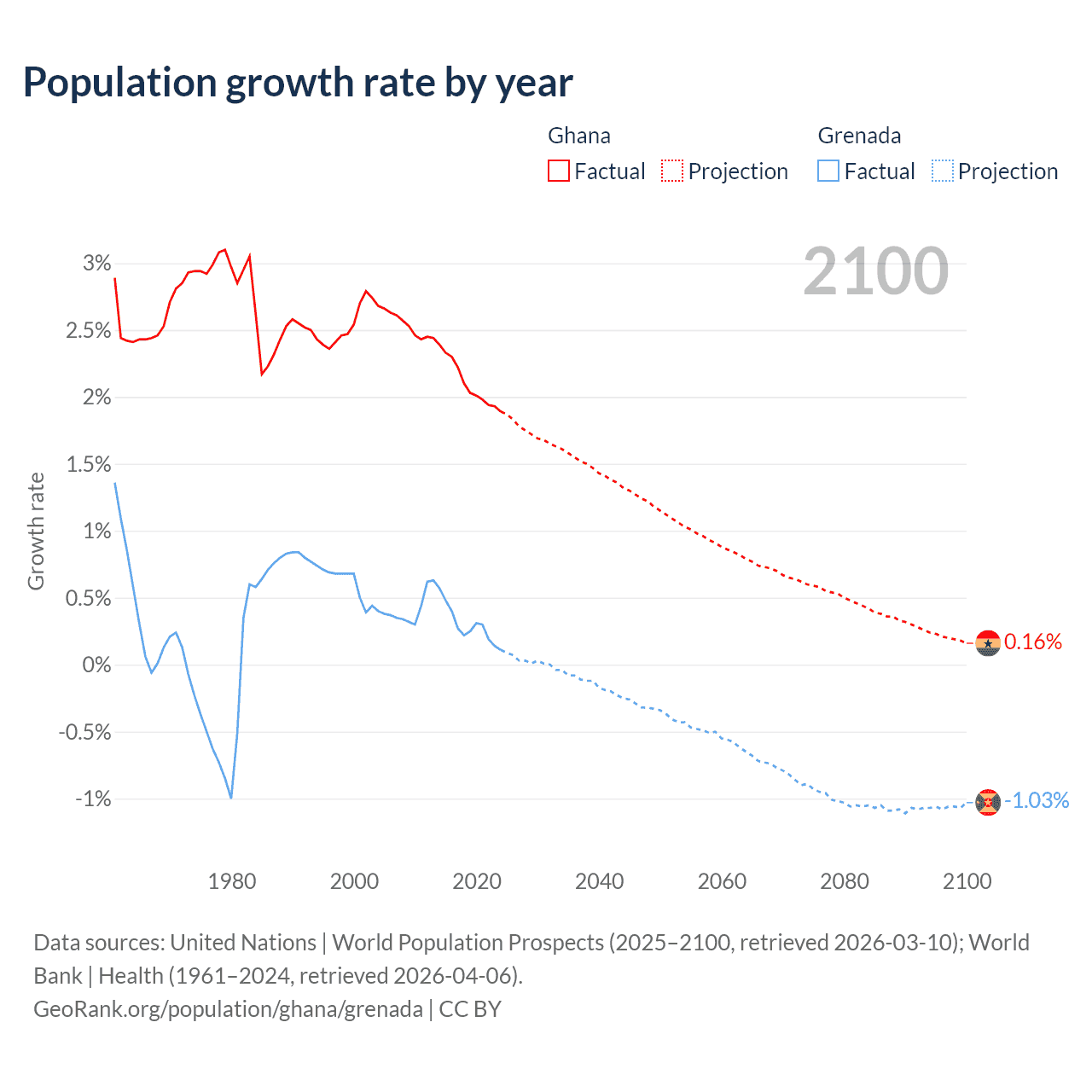 - For the last 10 years, Ghana has had an average growth rate of +2.1% per year vs +0.29% in Grenada.
