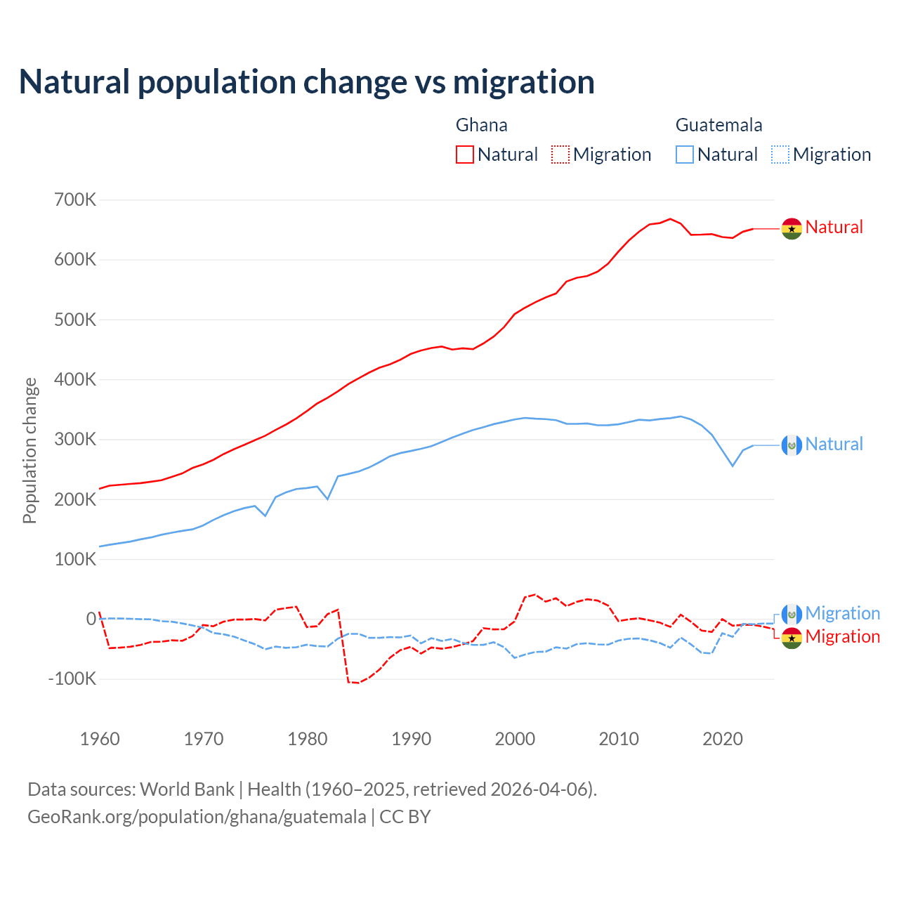 Over the last 10 years, 98.6% of the population change in Ghana is from natural causes (a gain of 6,484,449 people) and 1.37% is from migration (a loss of 90,310 people). In Guatemala 89.8% is from natural causes (a gain of 3,077,847 people) and 10.2% is from migration (a loss of 347,818 people).