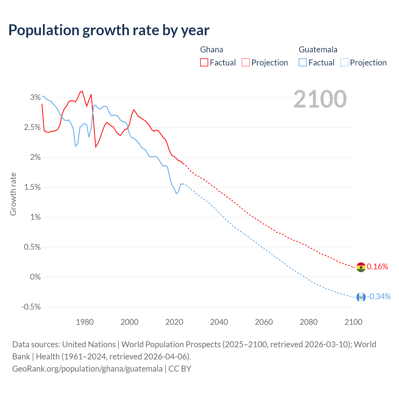 - For the last 10 years, Ghana has had an average growth rate of +2.1% per year vs +1.64% in Guatemala.