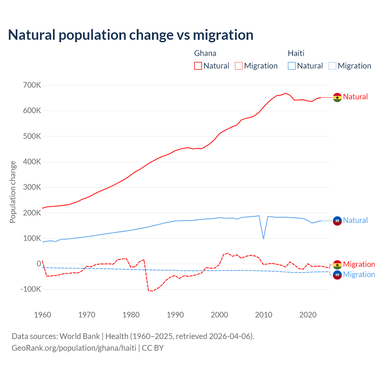 Over the last 10 years, 98.6% of the population change in Ghana is from natural causes (a gain of 6,484,449 people) and 1.37% is from migration (a loss of 90,310 people). In Haiti 83.9% is from natural causes (a gain of 1,740,319 people) and 16.1% is from migration (a loss of 333,076 people).
