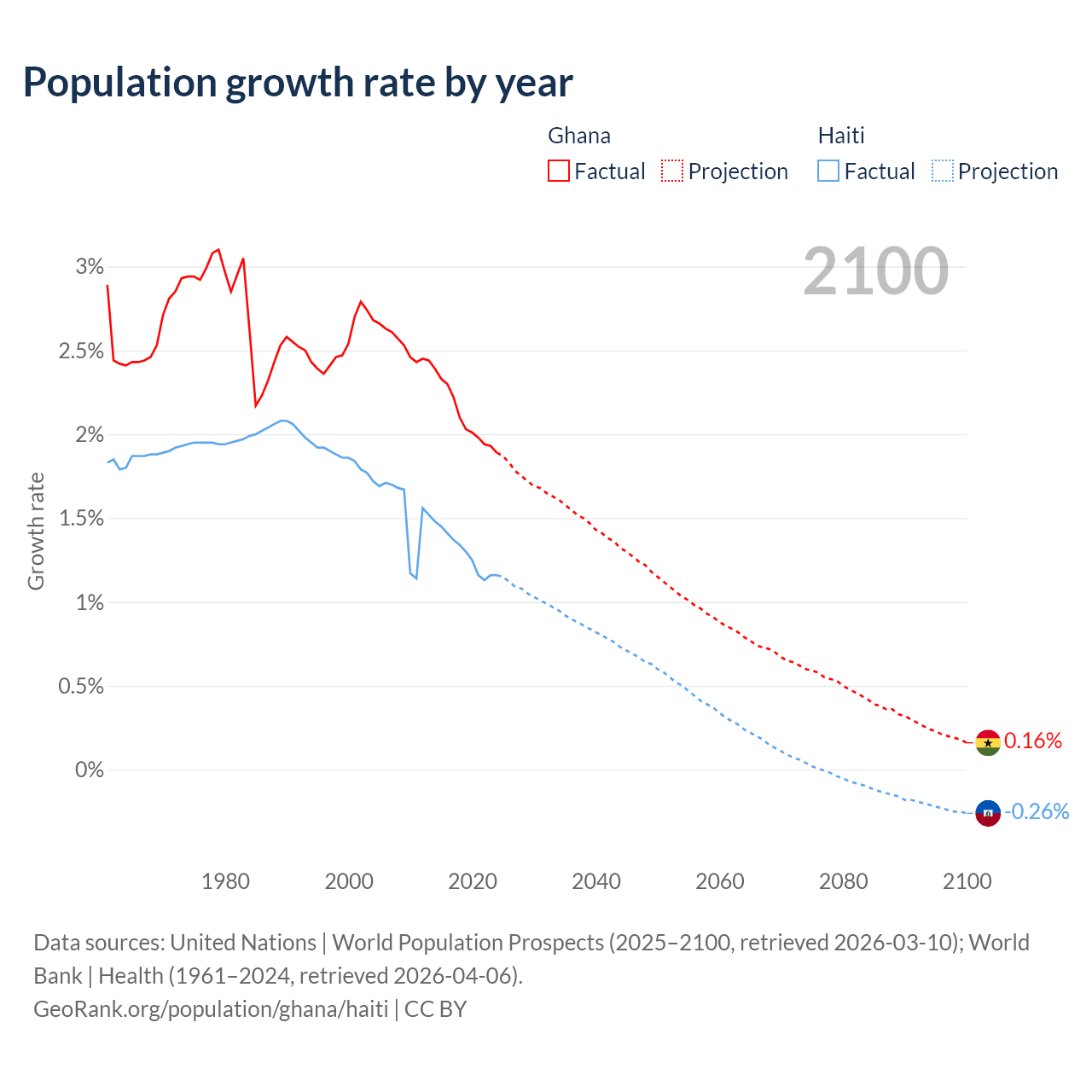 - For the last 10 years, Ghana has had an average growth rate of +2.1% per year vs +1.29% in Haiti.