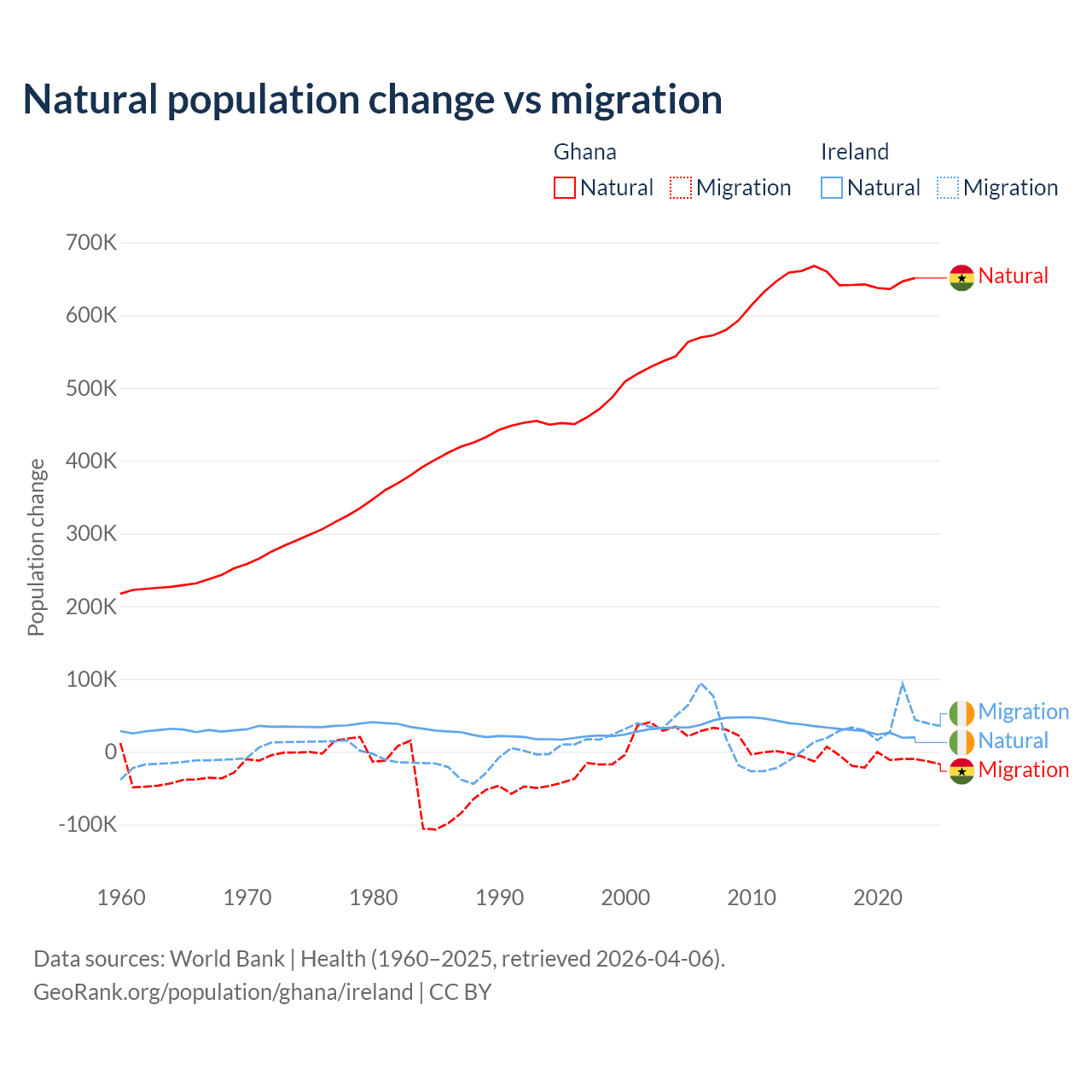 Over the last 10 years, 98.6% of the population change in Ghana is from natural causes (a gain of 6,484,449 people) and 1.37% is from migration (a loss of 90,310 people). In Ireland 48.2% is from natural causes (a gain of 284,644 people) and 51.8% is from migration (a gain of 305,297 people).
