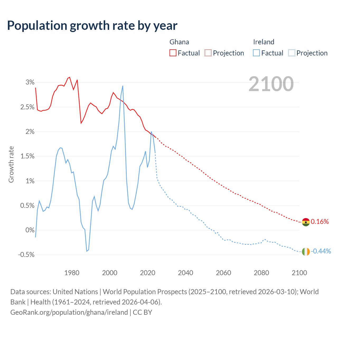 - For the last 10 years, Ghana has had an average growth rate of +2.1% per year vs +1.41% in Ireland.