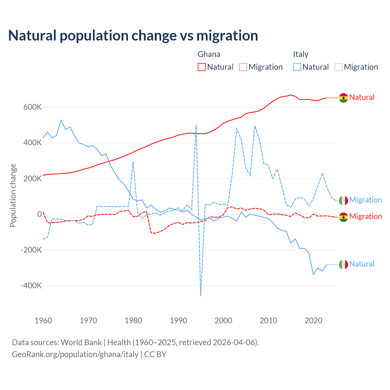 Over the last 10 years, 98.6% of the population change in Ghana is from natural causes (a gain of 6,484,449 people) and 1.37% is from migration (a loss of 90,310 people). In Italy 68.6% is from natural causes (a loss of 2,239,084 people) and 31.4% is from migration (a gain of 1,026,128 people).