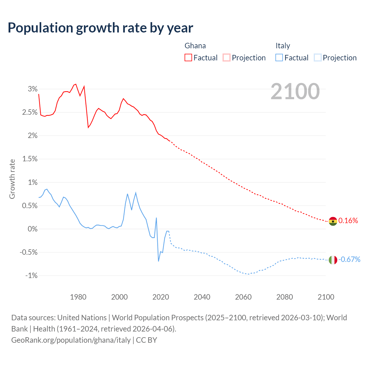 - For the last 10 years, Ghana has had an average growth rate of +2.1% per year vs -0.21% in Italy.