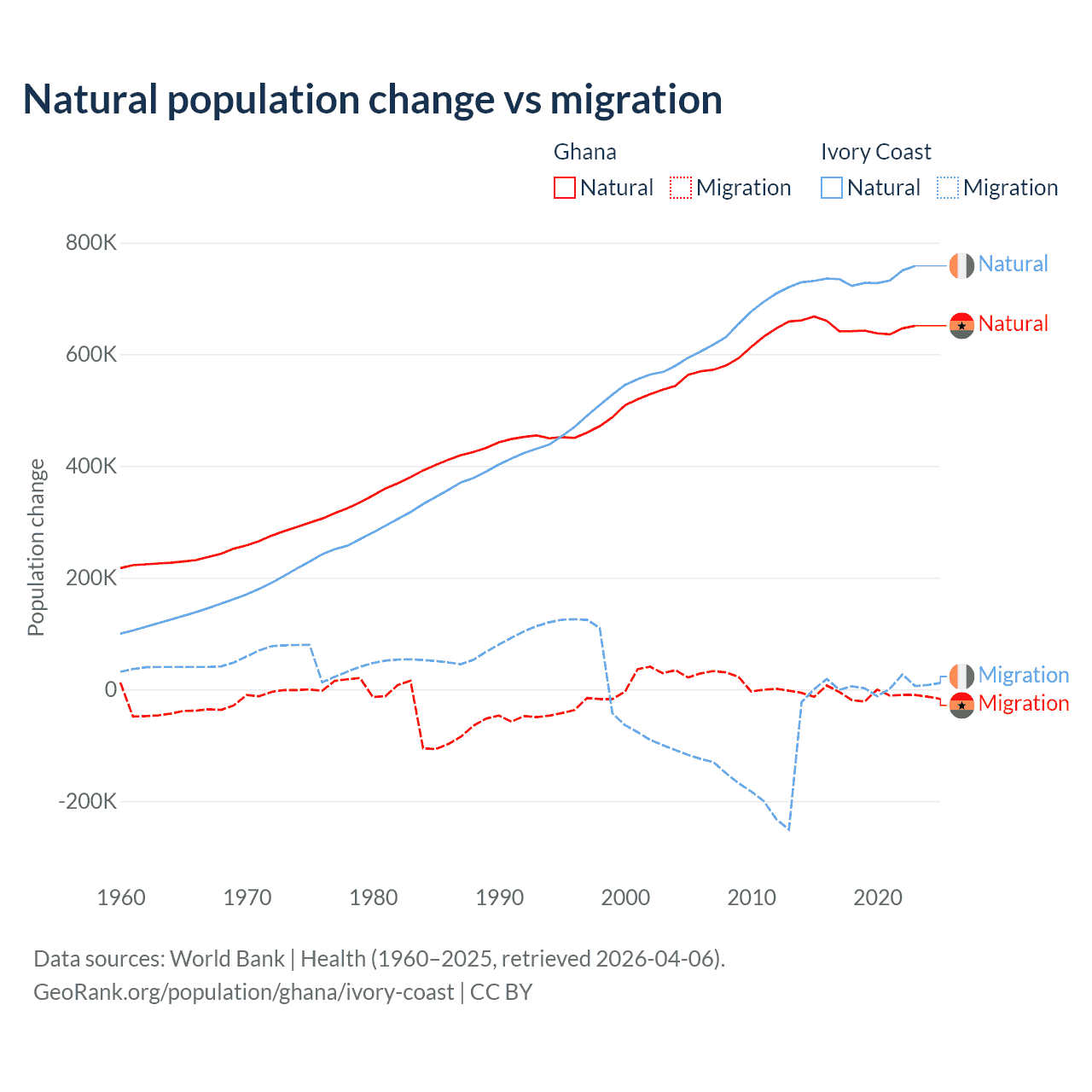 Over the last 10 years, 98.6% of the population change in Ghana is from natural causes (a gain of 6,484,449 people) and 1.37% is from migration (a loss of 90,310 people). In Ivory Coast 99.7% is from natural causes (a gain of 7,348,944 people) and 0.33% is from migration (a gain of 24,432 people).
