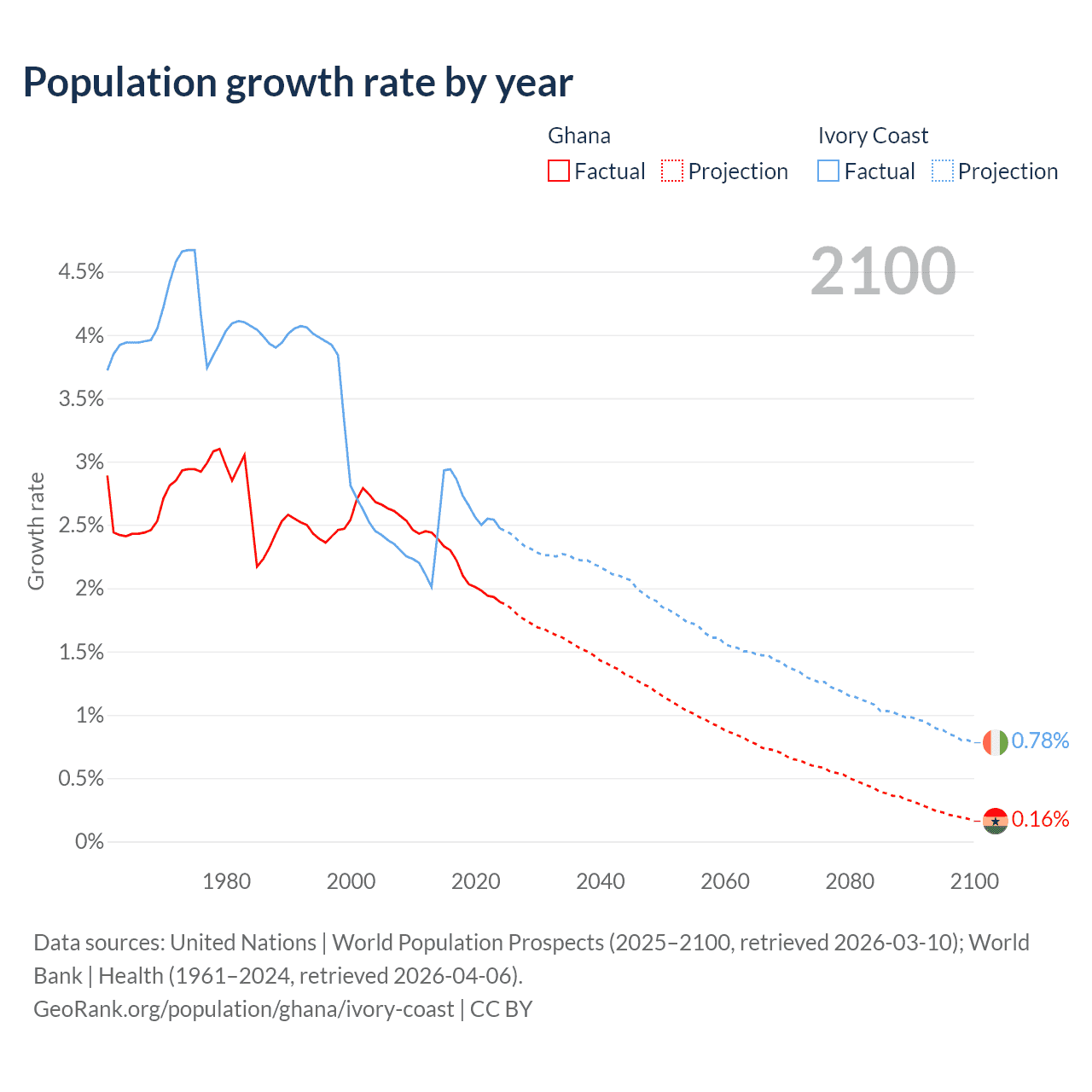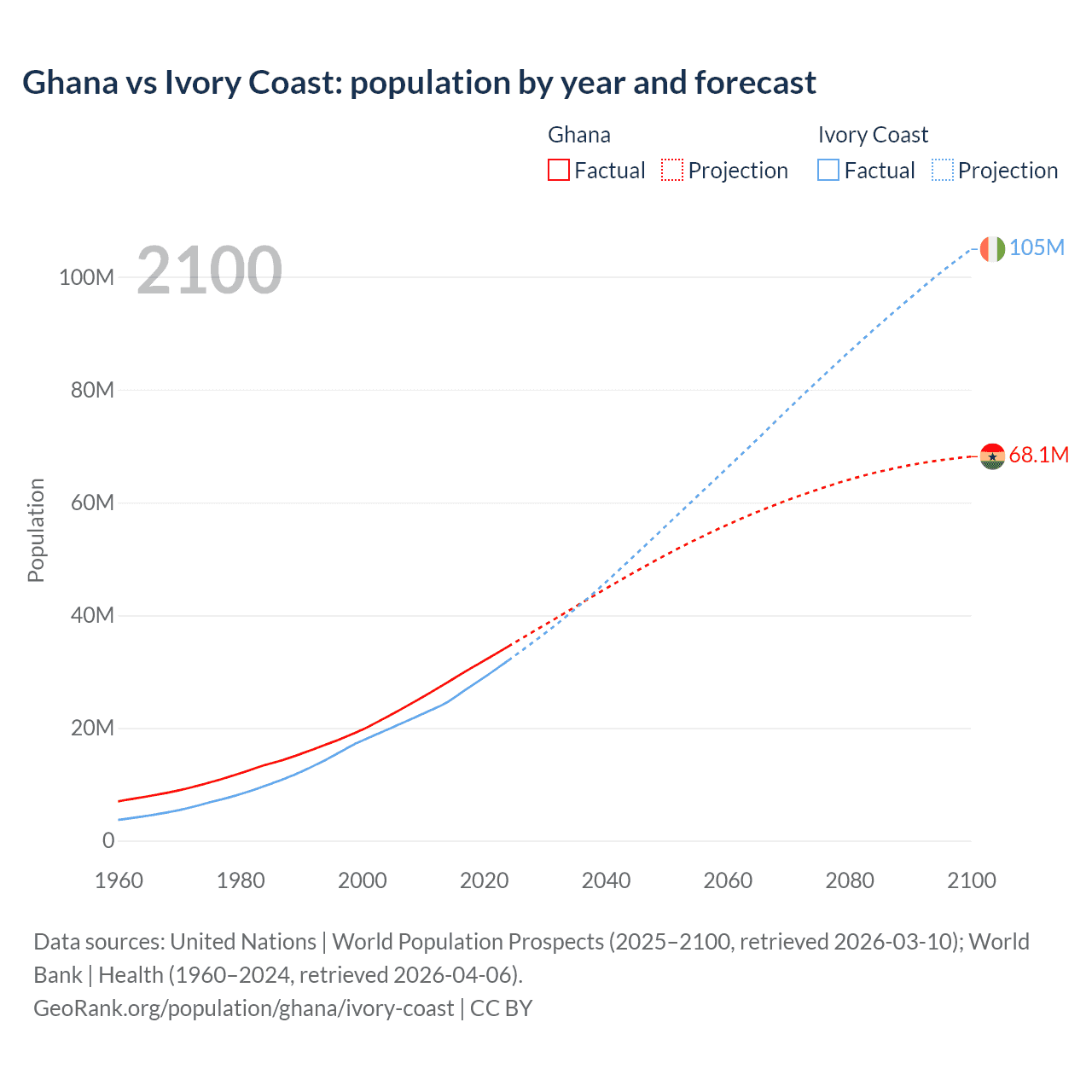 Ghana vs Ivory Coast: population by year and forecast