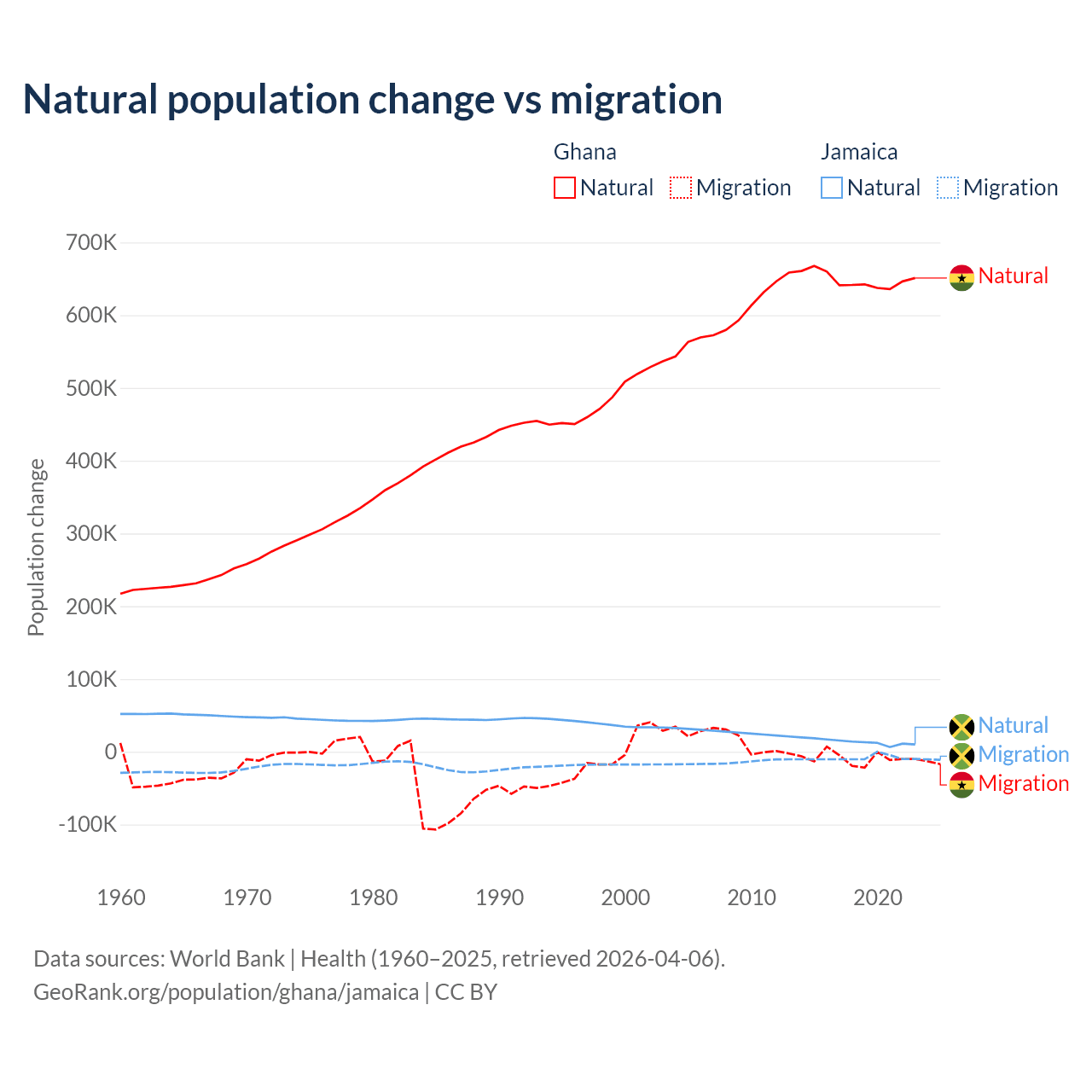 Over the last 10 years, 98.6% of the population change in Ghana is from natural causes (a gain of 6,484,449 people) and 1.37% is from migration (a loss of 90,310 people). In Jamaica 61.3% is from natural causes (a gain of 137,465 people) and 38.7% is from migration (a loss of 86,681 people).