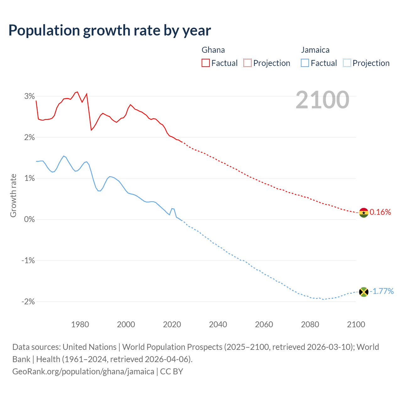 - For the last 10 years, Ghana has had an average growth rate of +2.1% per year vs +0.18% in Jamaica.