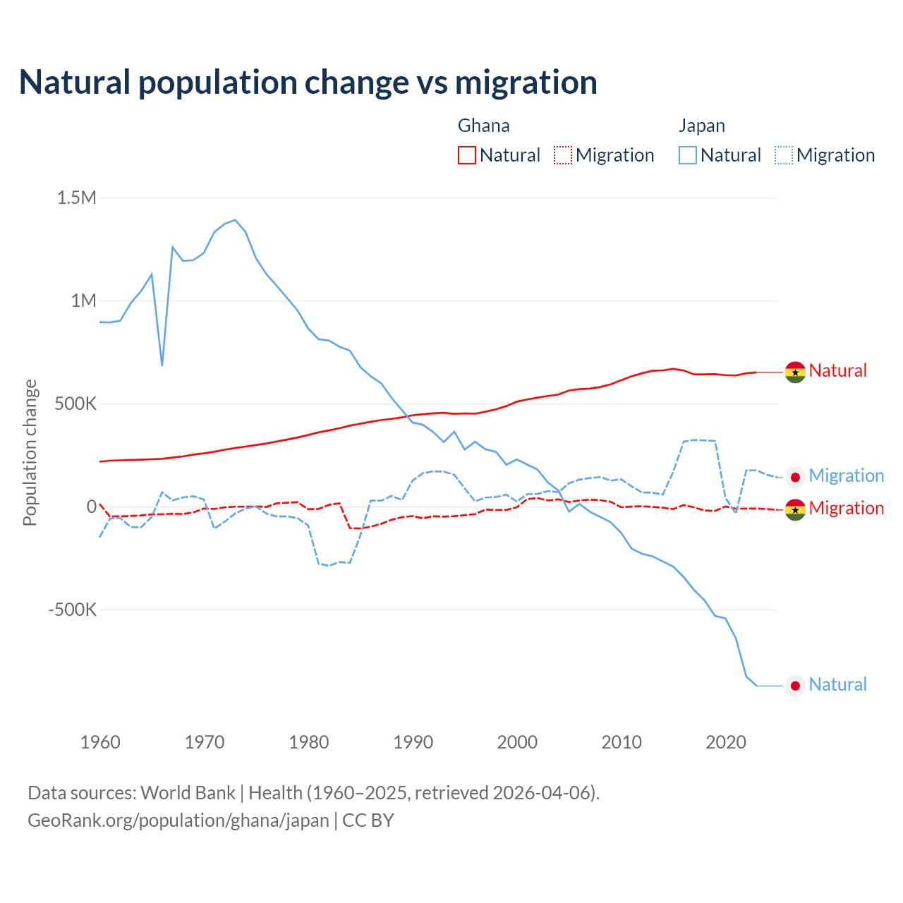 Over the last 10 years, 98.6% of the population change in Ghana is from natural causes (a gain of 6,484,449 people) and 1.37% is from migration (a loss of 90,310 people). In Japan 73.6% is from natural causes (a loss of 5,178,838 people) and 26.4% is from migration (a gain of 1,860,103 people).