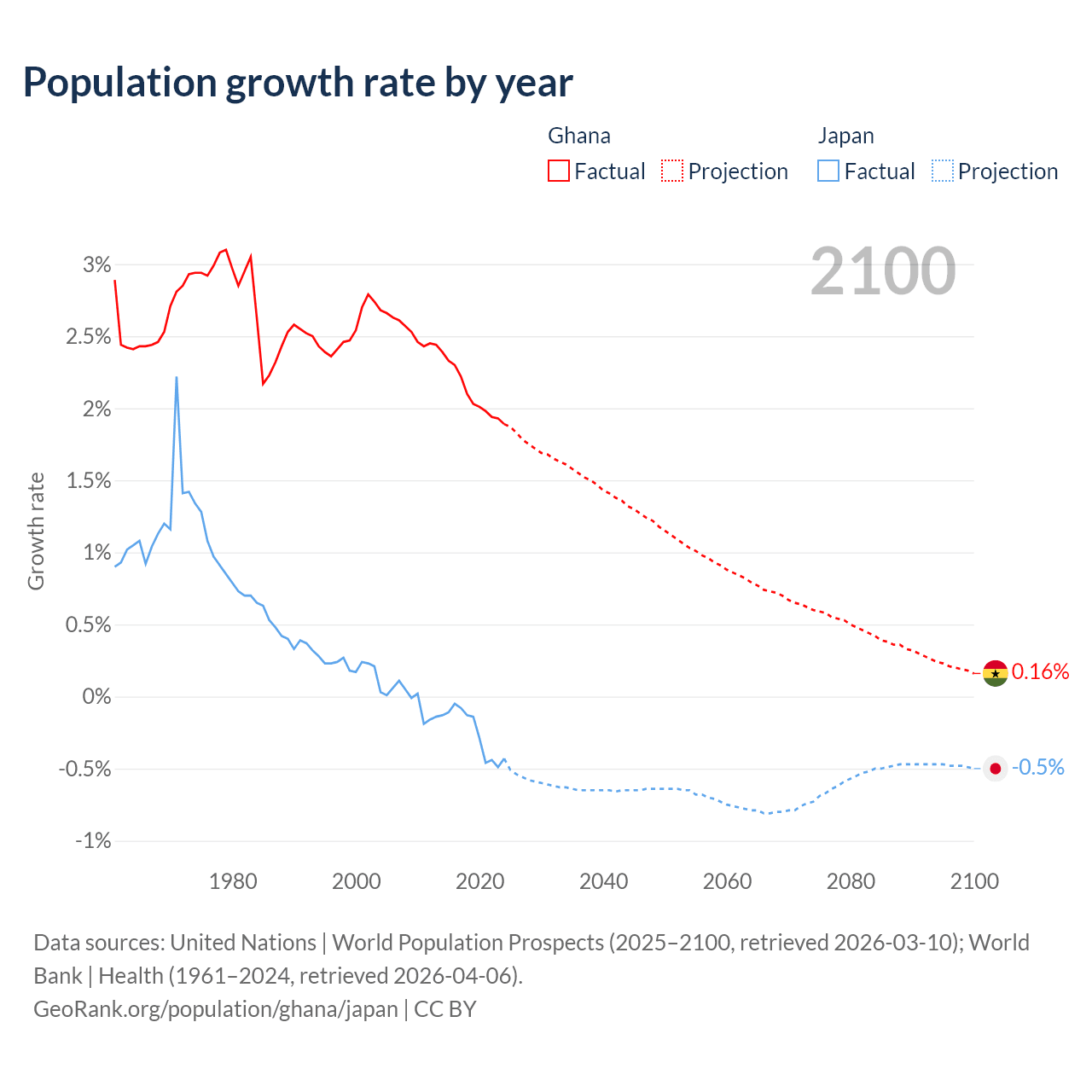 - For the last 10 years, Ghana has had an average growth rate of +2.1% per year vs -0.25% in Japan.