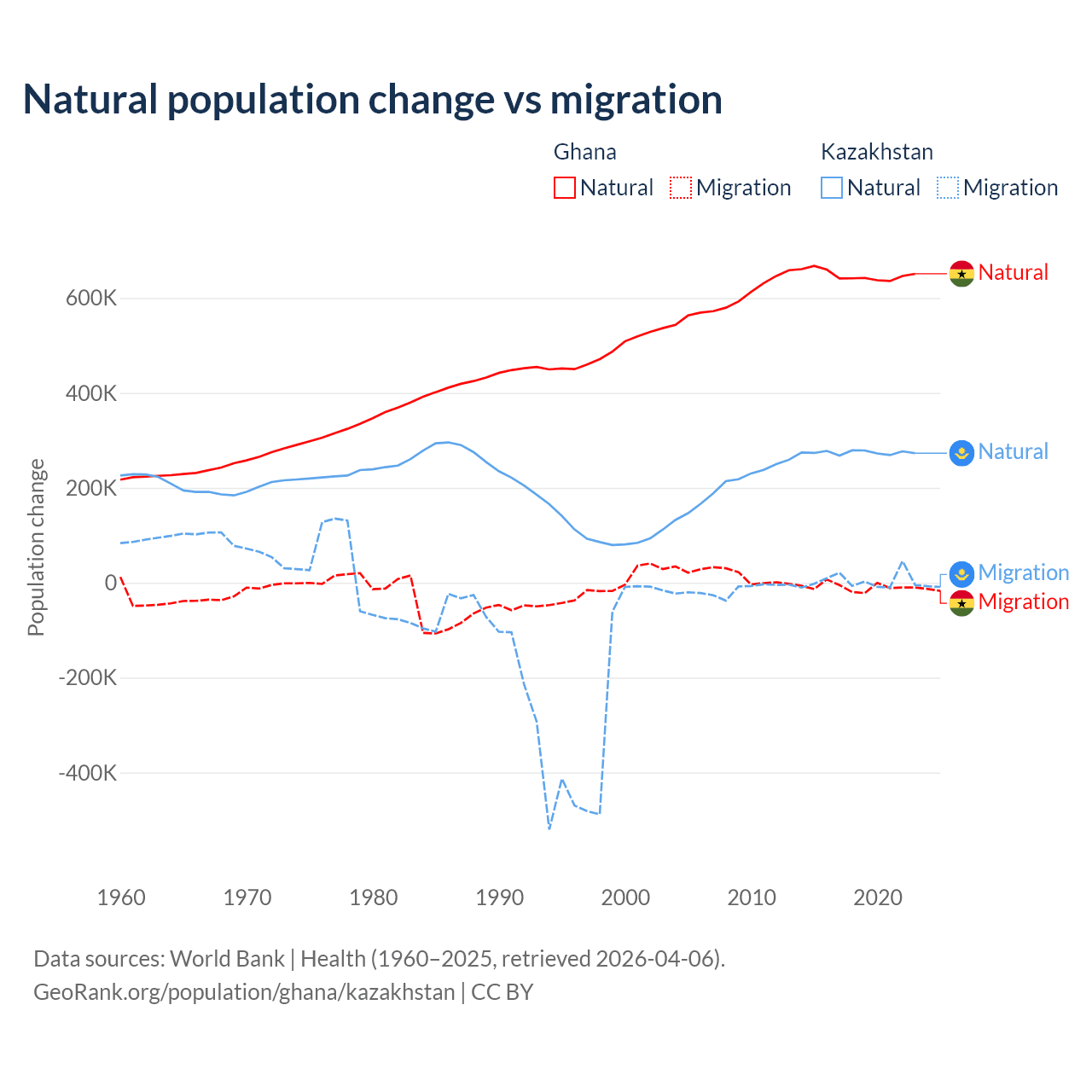 Over the last 10 years, 98.6% of the population change in Ghana is from natural causes (a gain of 6,484,449 people) and 1.37% is from migration (a loss of 90,310 people). In Kazakhstan 98.7% is from natural causes (a gain of 2,743,094 people) and 1.33% is from migration (a gain of 36,908 people).