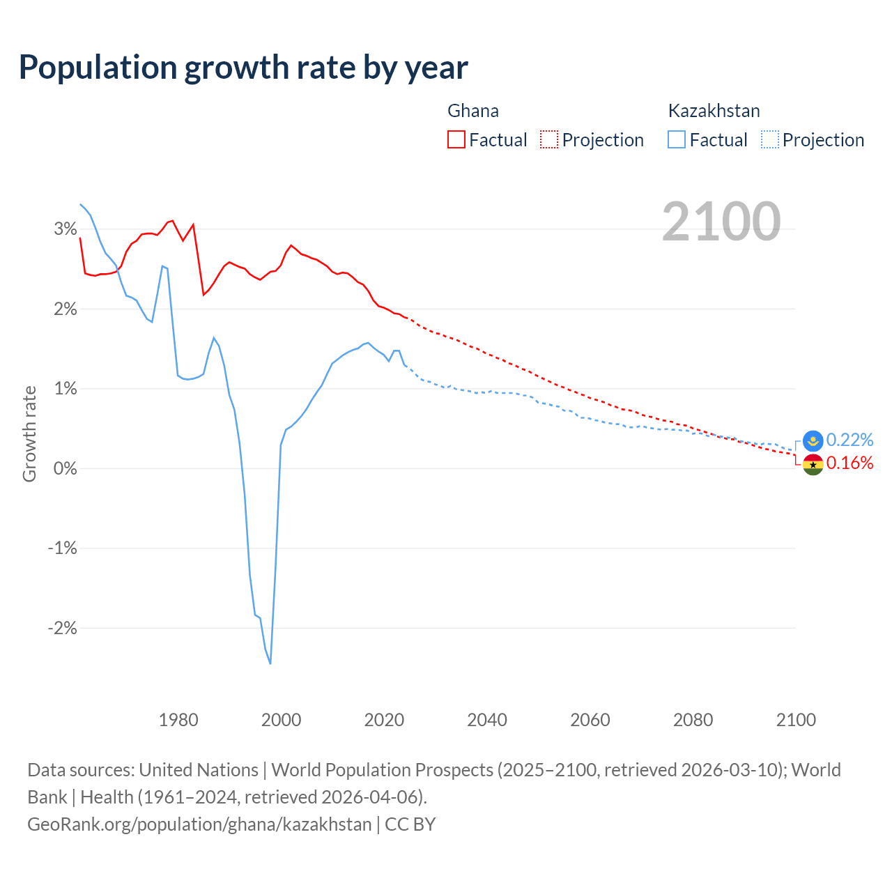 - For the last 10 years, Ghana has had an average growth rate of +2.1% per year vs +1.46% in Kazakhstan.