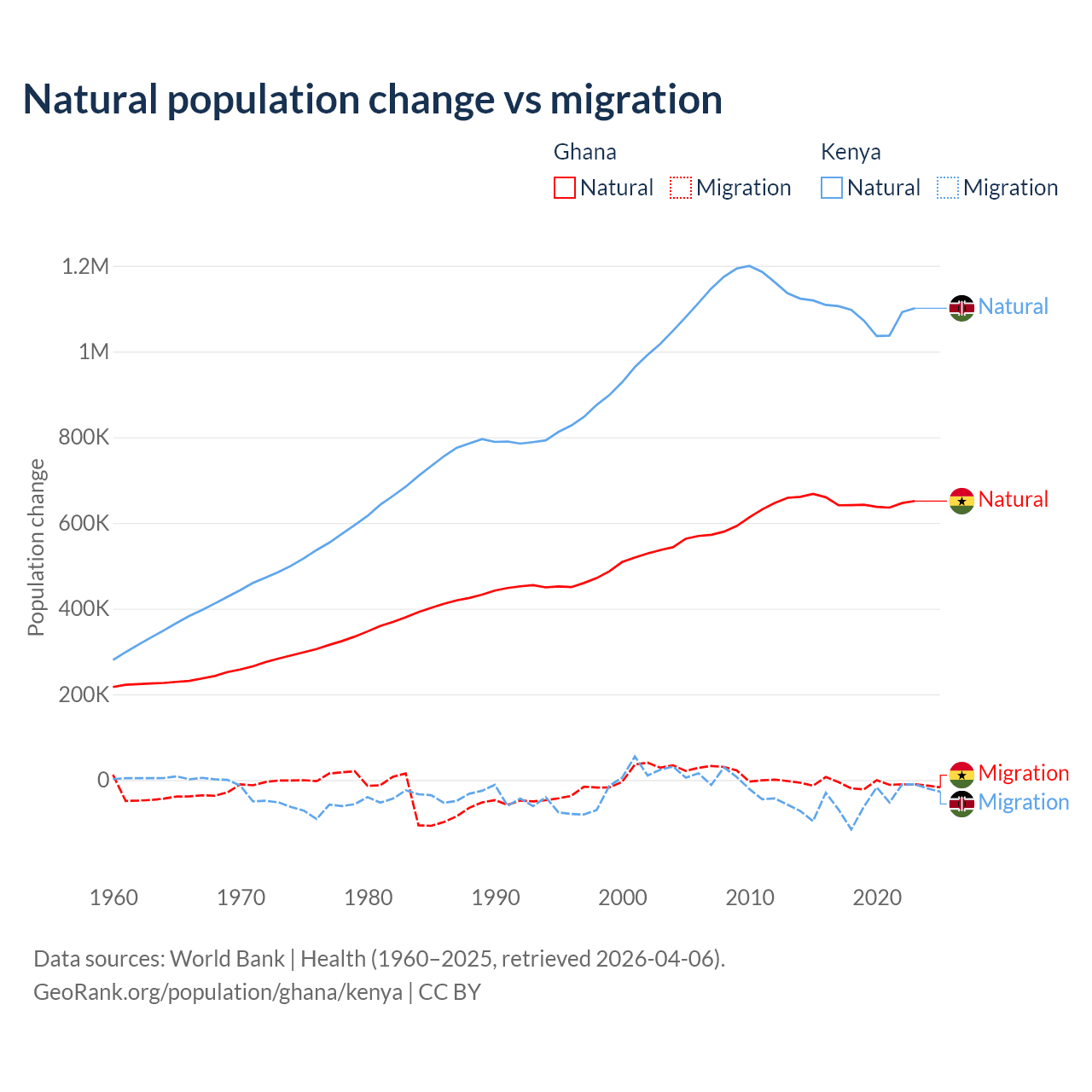 Over the last 10 years, 98.6% of the population change in Ghana is from natural causes (a gain of 6,484,449 people) and 1.37% is from migration (a loss of 90,310 people). In Kenya 95.3% is from natural causes (a gain of 10,892,362 people) and 4.67% is from migration (a loss of 533,876 people).