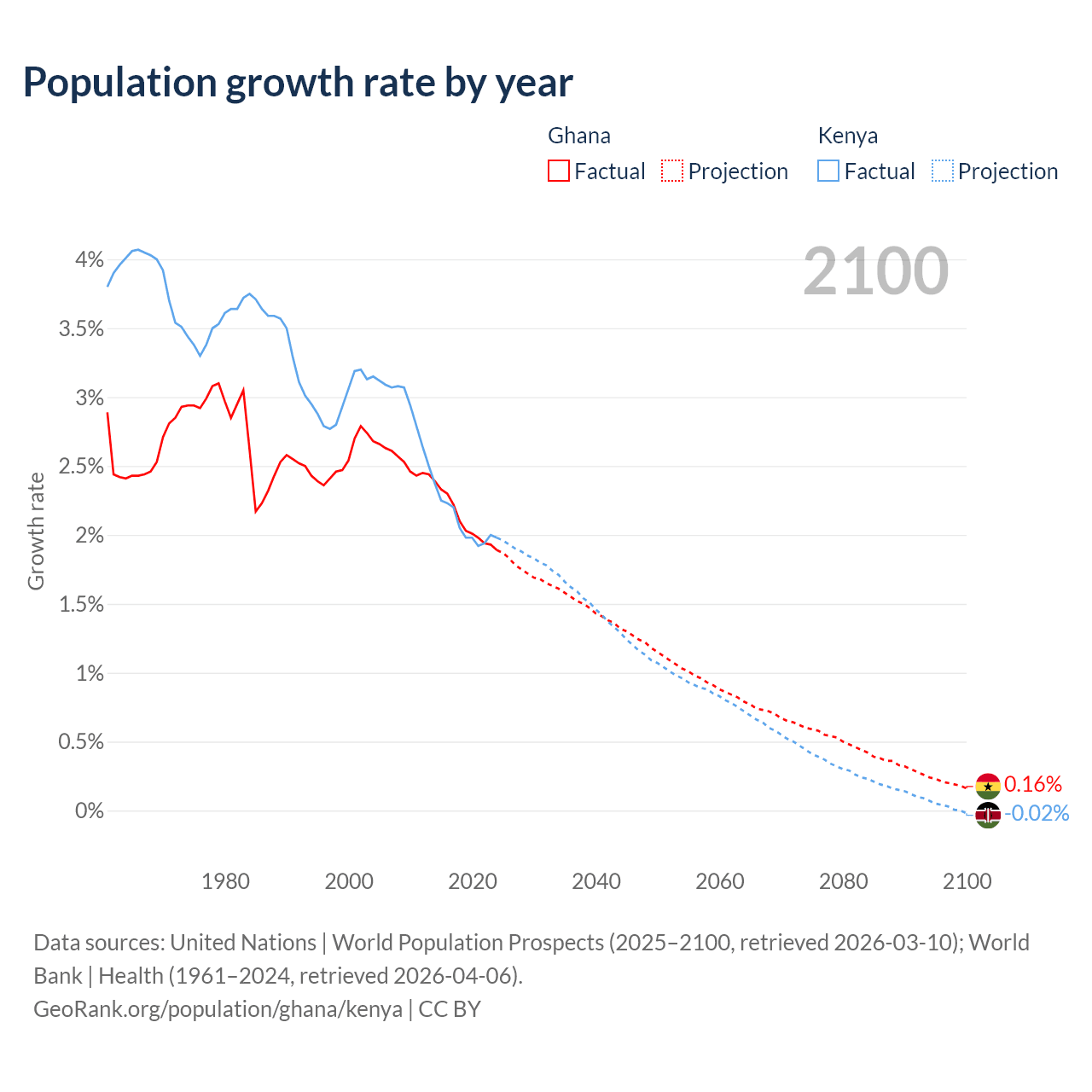 - For the last 10 years, Ghana has had an average growth rate of +2.1% per year vs +2.08% in Kenya.