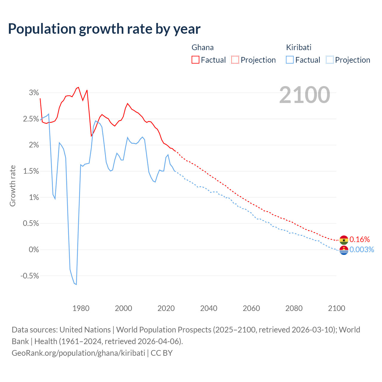 - For the last 10 years, Ghana has had an average growth rate of +2.1% per year vs +1.53% in Kiribati.