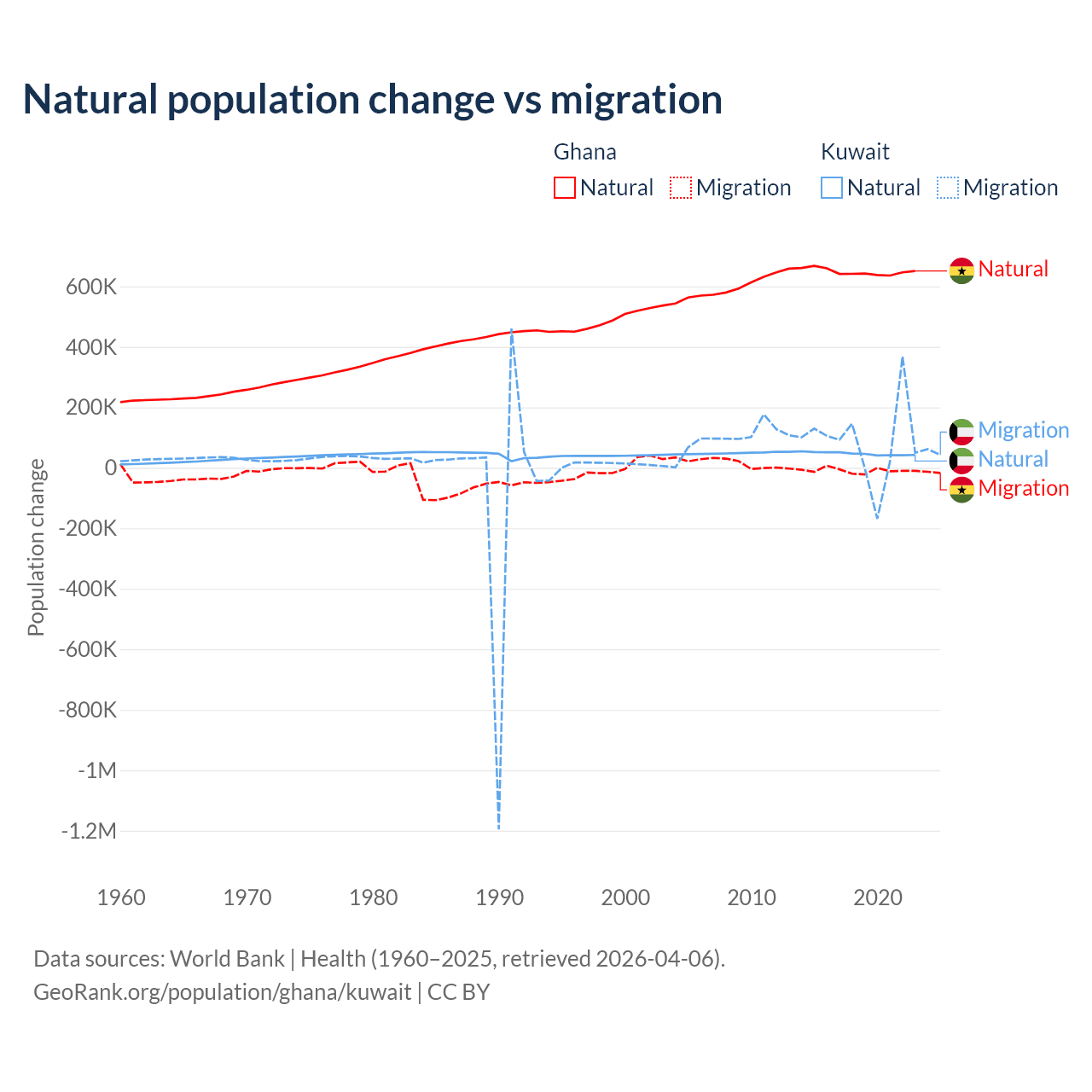 Over the last 10 years, 98.6% of the population change in Ghana is from natural causes (a gain of 6,484,449 people) and 1.37% is from migration (a loss of 90,310 people). In Kuwait 35.8% is from natural causes (a gain of 470,645 people) and 64.2% is from migration (a gain of 845,142 people).
