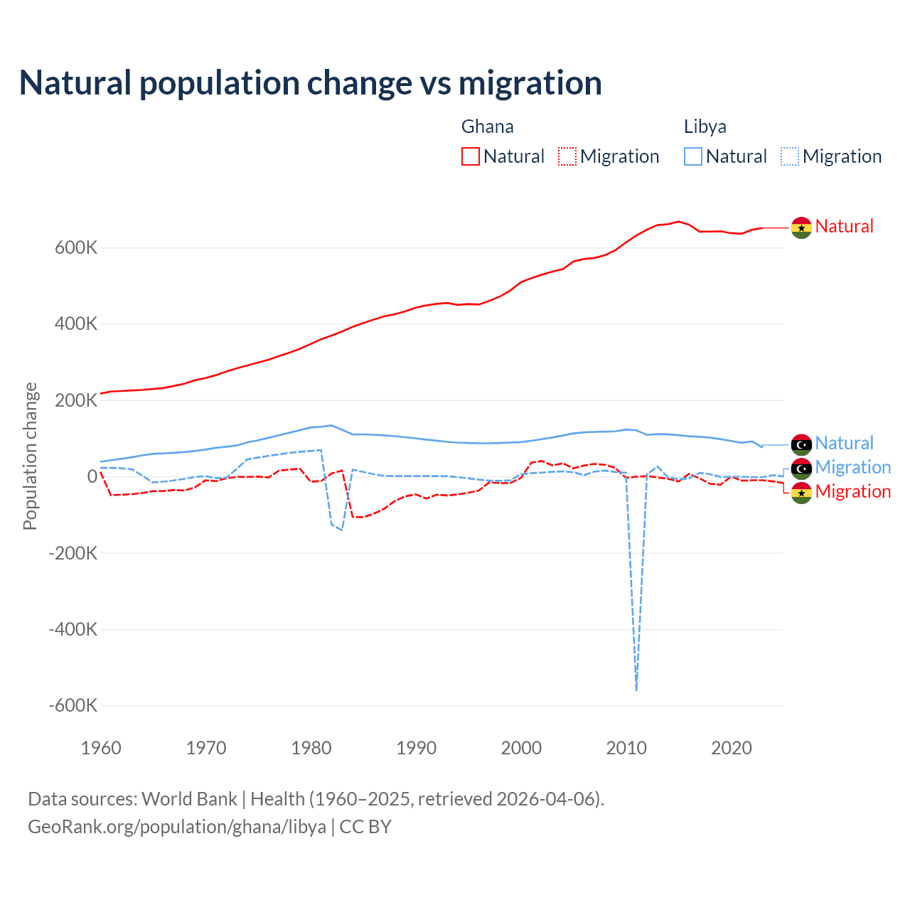 Over the last 10 years, 98.6% of the population change in Ghana is from natural causes (a gain of 6,484,449 people) and 1.37% is from migration (a loss of 90,310 people). In Libya 99.4% is from natural causes (a gain of 975,799 people) and 0.63% is from migration (a loss of 6,150 people).
