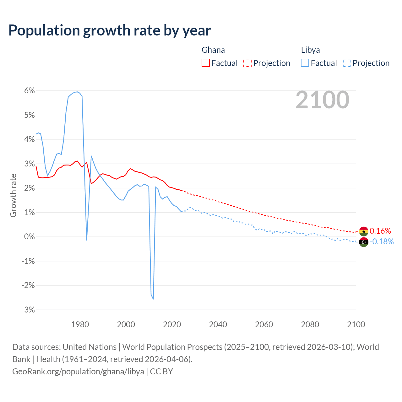 - For the last 10 years, Ghana has had an average growth rate of +2.1% per year vs +1.44% in Libya.