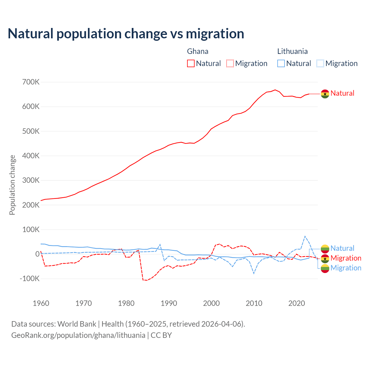 Over the last 10 years, 98.6% of the population change in Ghana is from natural causes (a gain of 6,484,449 people) and 1.37% is from migration (a loss of 90,310 people). In Lithuania 68.7% is from natural causes (a loss of 153,859 people) and 31.3% is from migration (a gain of 70,196 people).