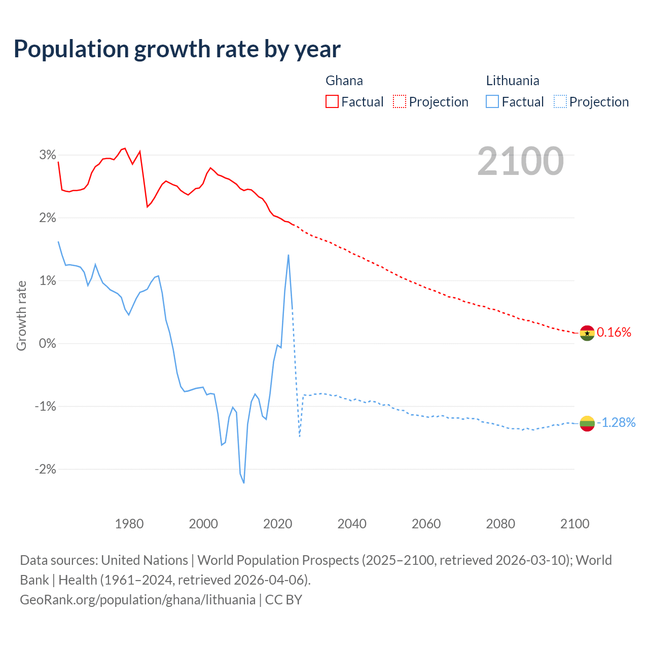 - For the last 10 years, Ghana has had an average growth rate of +2.1% per year vs -0.22% in Lithuania.